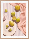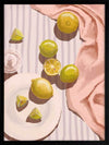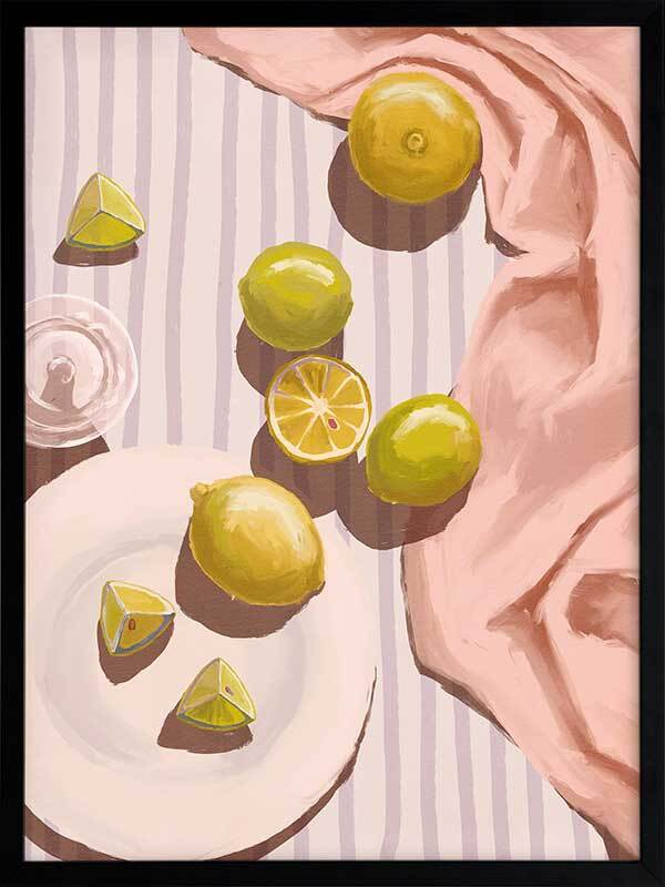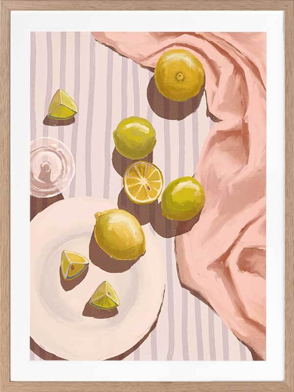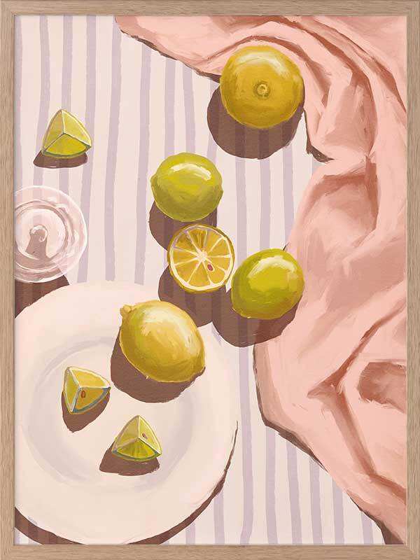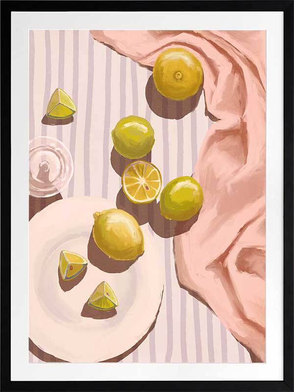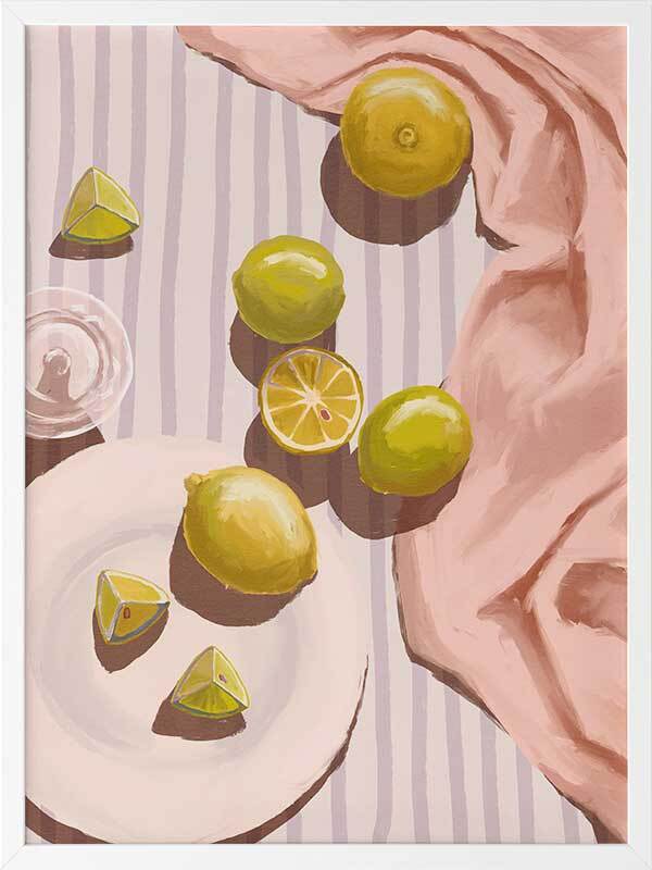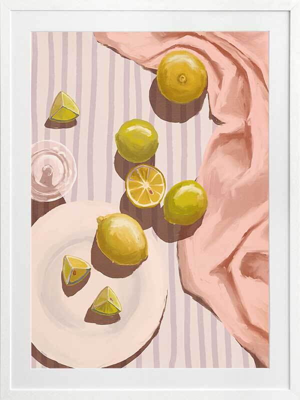Sour Pink Framed Art Print - Fresh juice, anyone? This artwork uses soft tones with a warm, gentle light source to bring a relaxing mood to any space. Pastel pink, purple, yellow and lime green complement a warm white shade for a cohesive look, making this a versatile piece for many interior design styles.