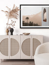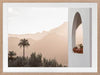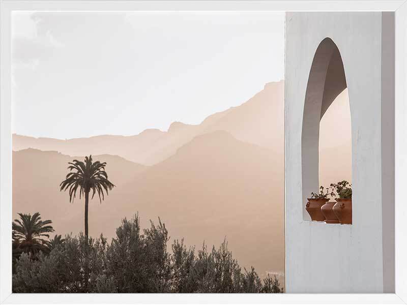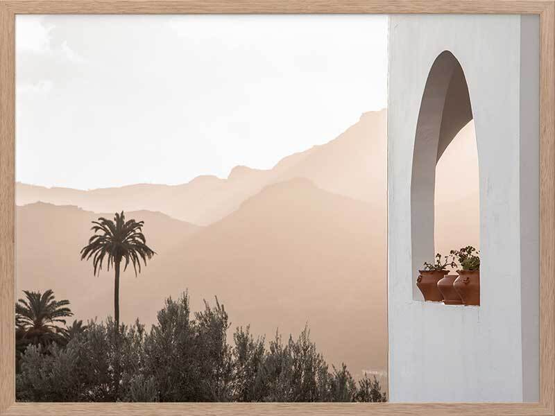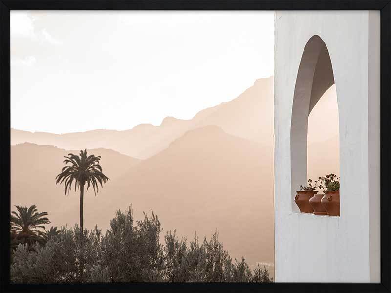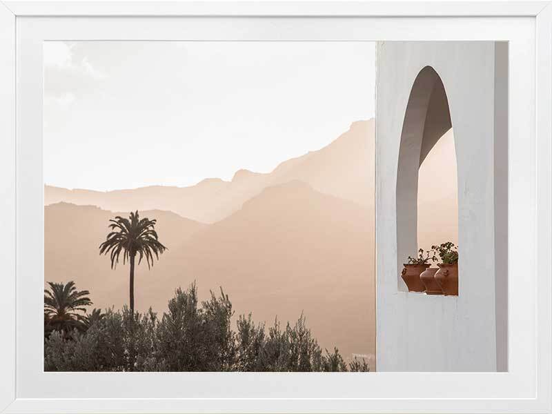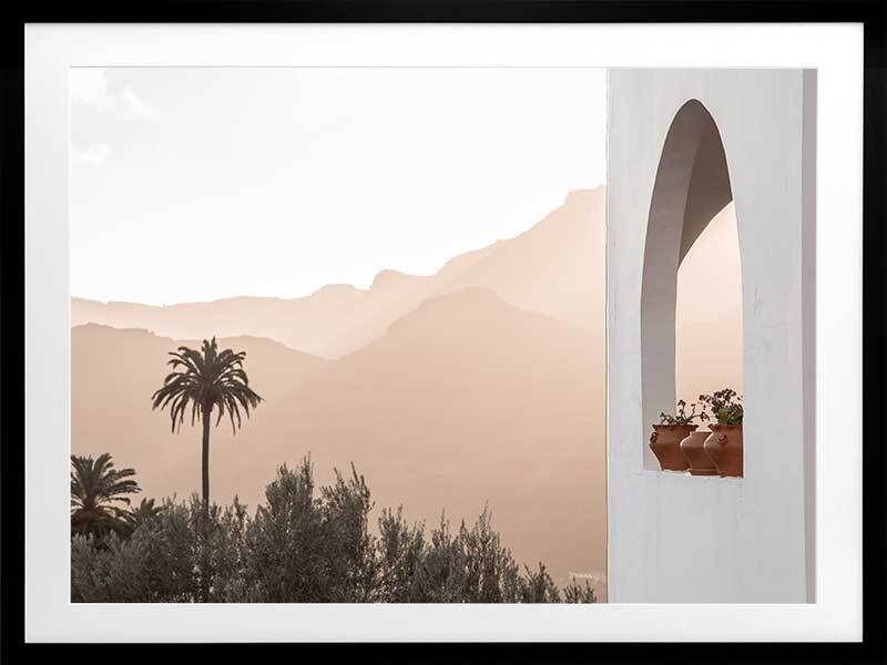 Spanish Arch Framed Art Print - Breathtakingly minimal, this photographic artwork highlights the beautiful mountainous landscape of Saint Lucia, Spain, contrasted against architectural elements. The colour palette is warm and light, featuring white and peach tones.
