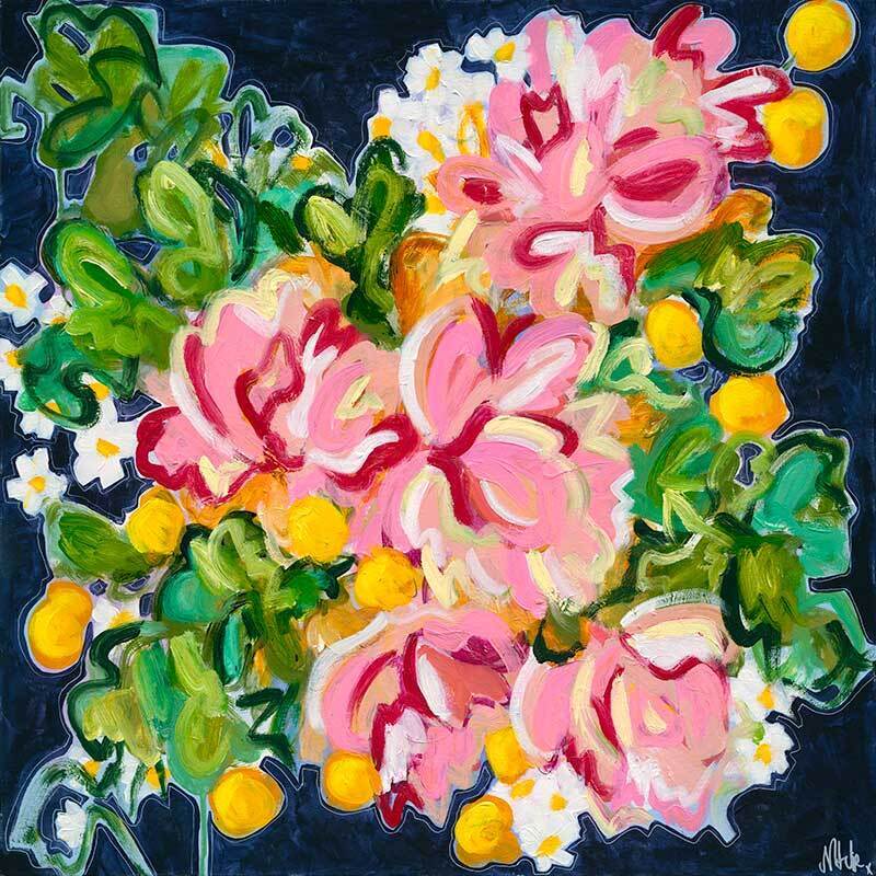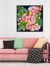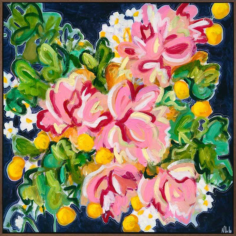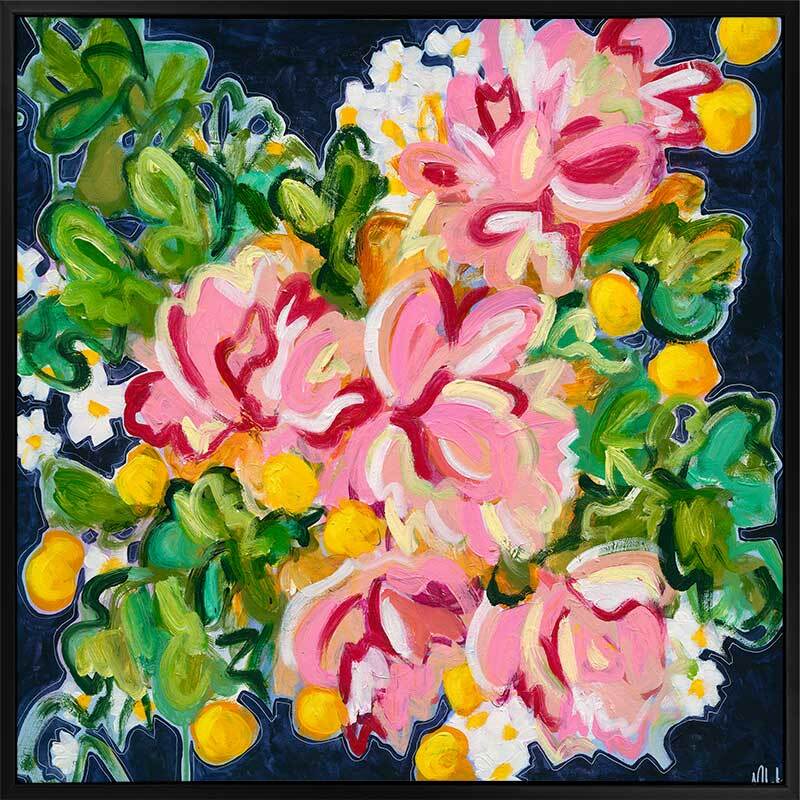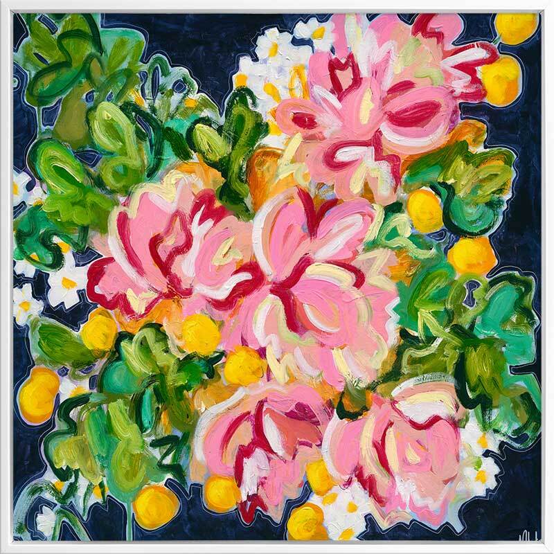 Spellbound Canvas Art Print - This beautifully composed and painted abstract floral piece features vibrant colours in a striking palette of pink, green and yellow against a deep blue background. The artwork is a celebration of light, life and the magic of love.