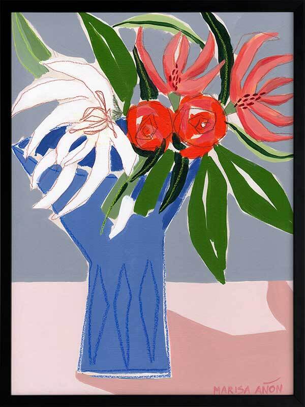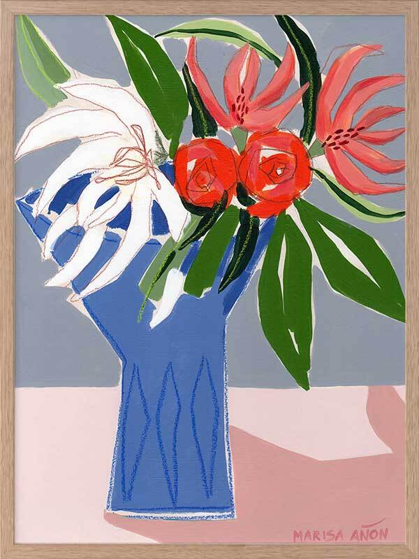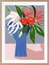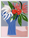 Spring Florals II Framed Art Print - With a classic primary colour palette featuring hints of rich green and pale maroon tones, this abstract still life of organically painted plants and leaves, perched in a tall blue vase, pairs beautifully with most interior design styles.