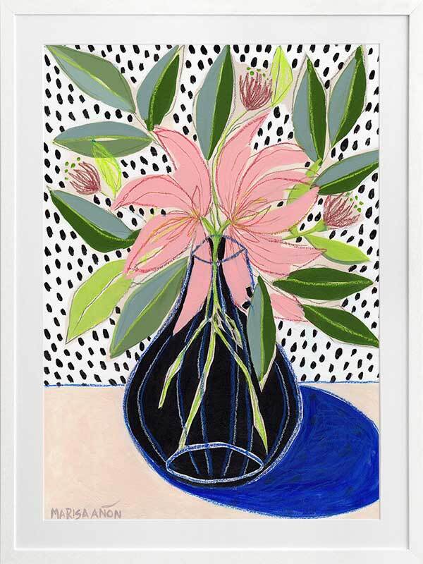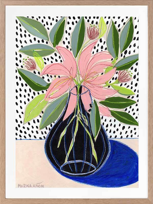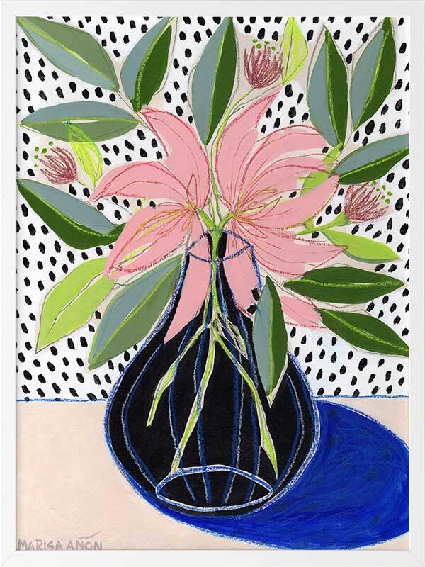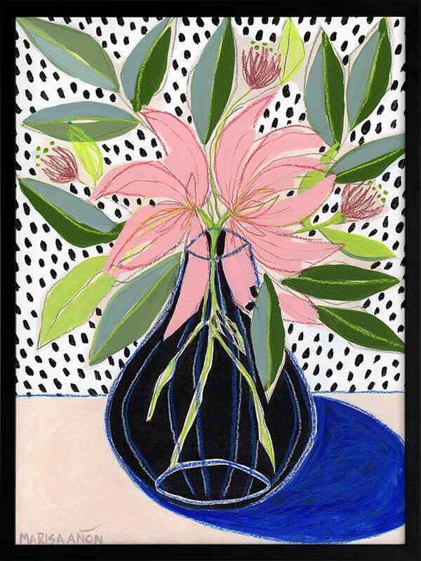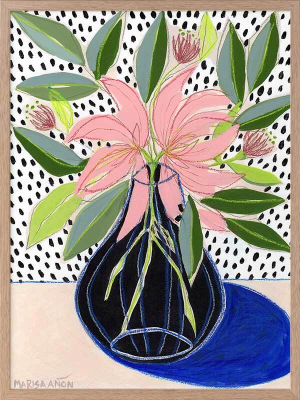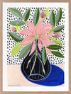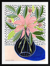 Spring Florals III Framed Art Print - With an understated colour palette featuring pops of rich green and cobalt blue, with the pale maroon tone of the blooming flowers, this abstract still life of organically painted plants and leaves, against a spotted black and white background, pairs beautifully with most interior design styles.