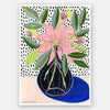 Spring Florals III Unframed Art Print - With an understated colour palette featuring pops of rich green and cobalt blue, with the pale maroon tone of the blooming flowers, this abstract still life of organically painted plants and leaves, against a spotted black and white background, pairs beautifully with most interior design styles.