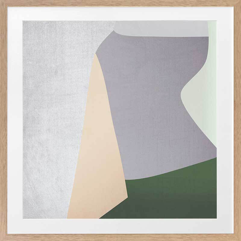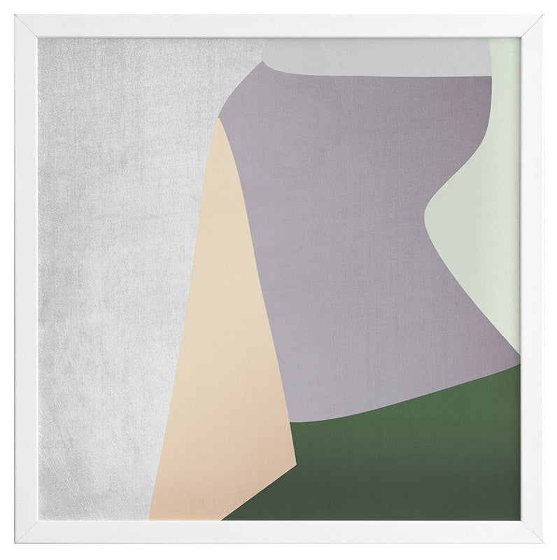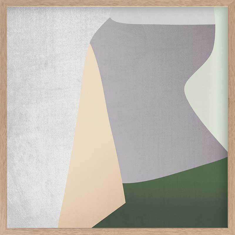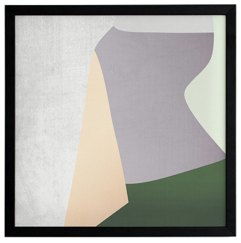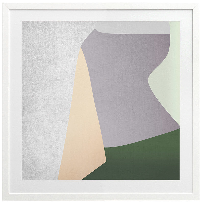 Stained Glass Framed Print: An abstract artwork featuring clean lines and shapes in muted grey, green, peach and purple tones. 2018 AUTUMN/WINTER COLLECTION: CONTINUUM