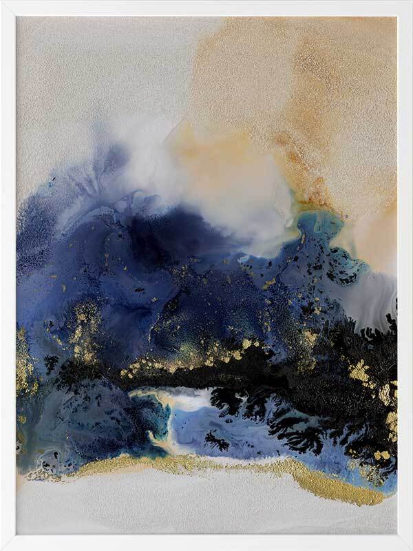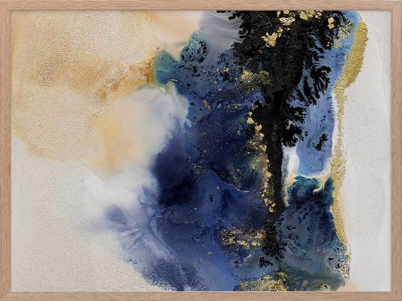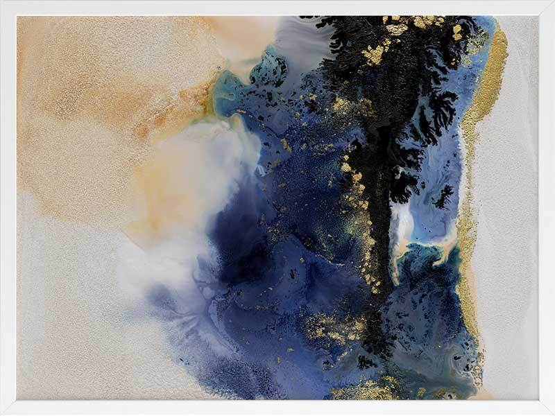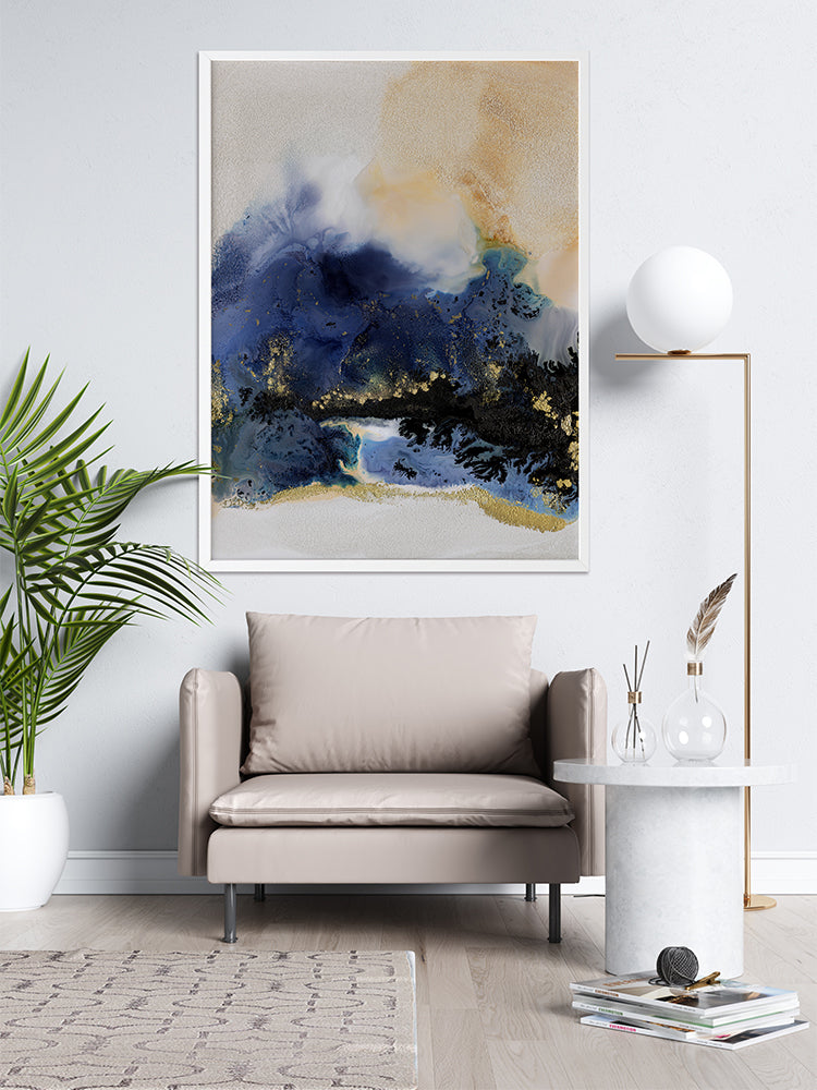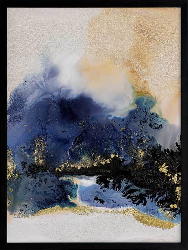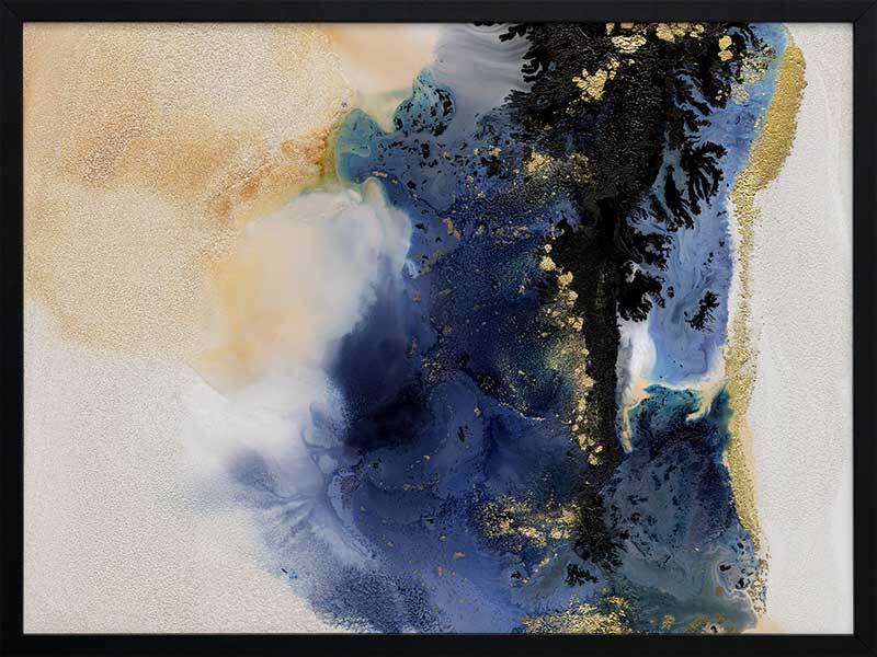 Starlight I Framed Art Print - An abstract artwork that is reminiscent of the night sky. Featuring a dreamy marbled blend of deep royal blue, creamy white and black inks, and accented with flecks of gold. Pairs with Starlight II.