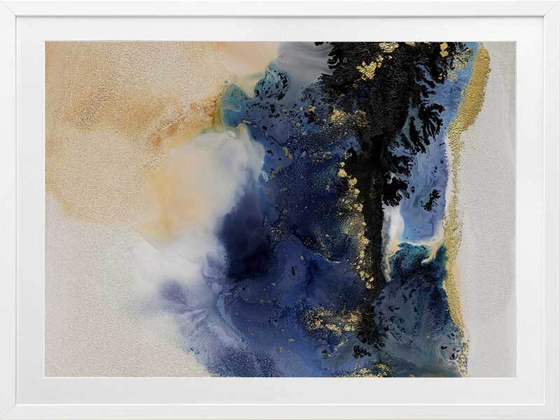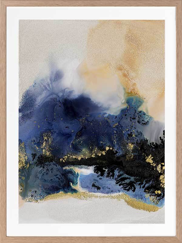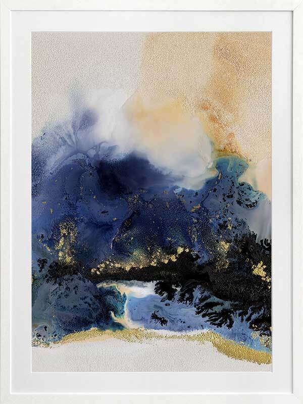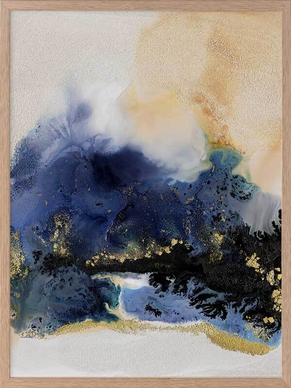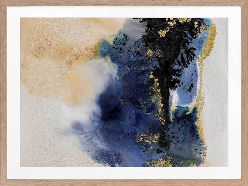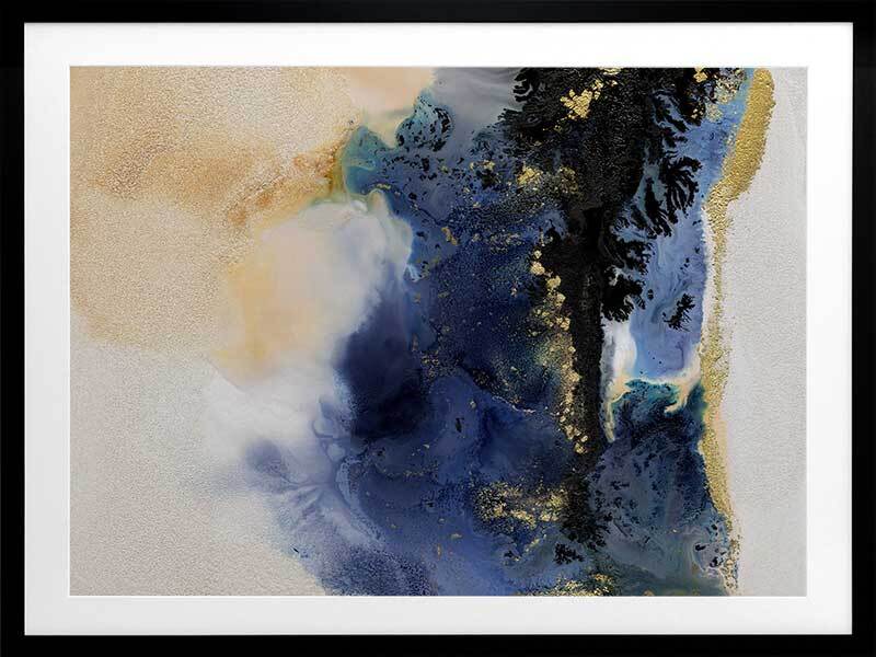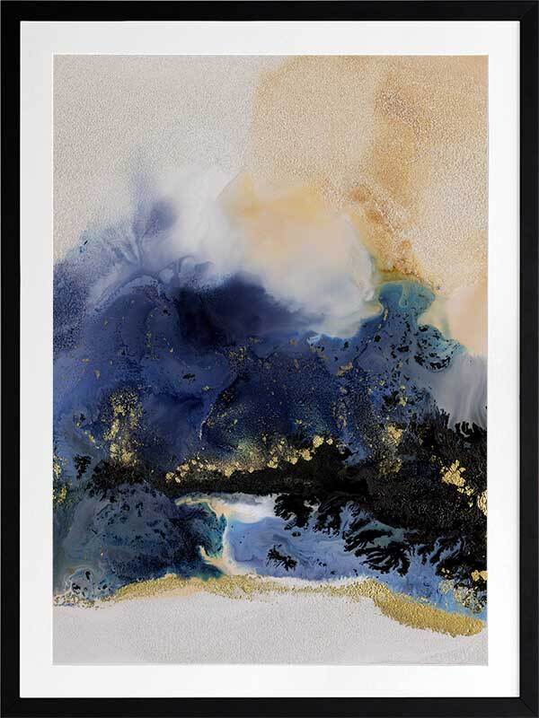 Starlight I Framed Art Print - An abstract artwork that is reminiscent of the night sky. Featuring a dreamy marbled blend of deep royal blue, creamy white and black inks, and accented with flecks of gold. Pairs with Starlight II.