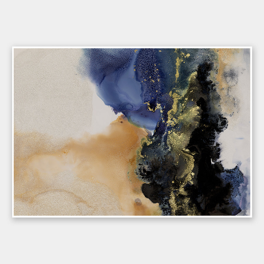 Starlight II Unframed Art Print - An abstract artwork that is reminiscent of the night sky. Featuring a dreamy marbled blend of deep royal blue, creamy white and black inks, and accented with flecks of gold. Pairs with Starlight I.