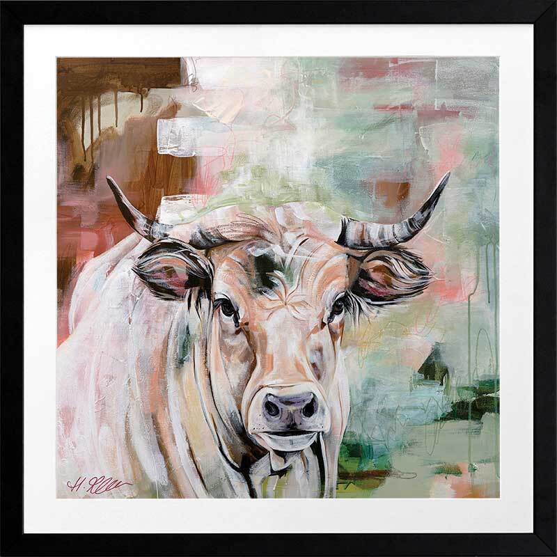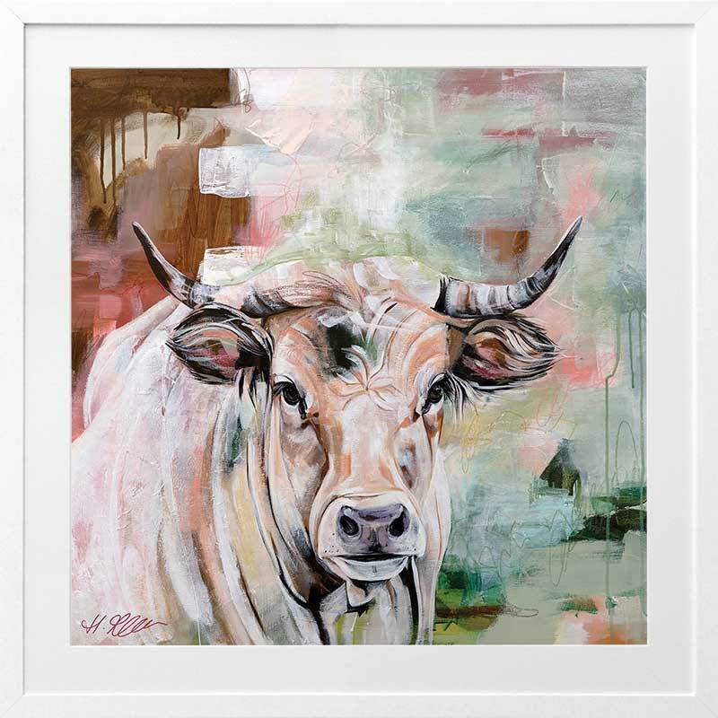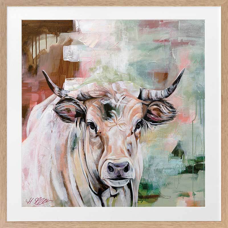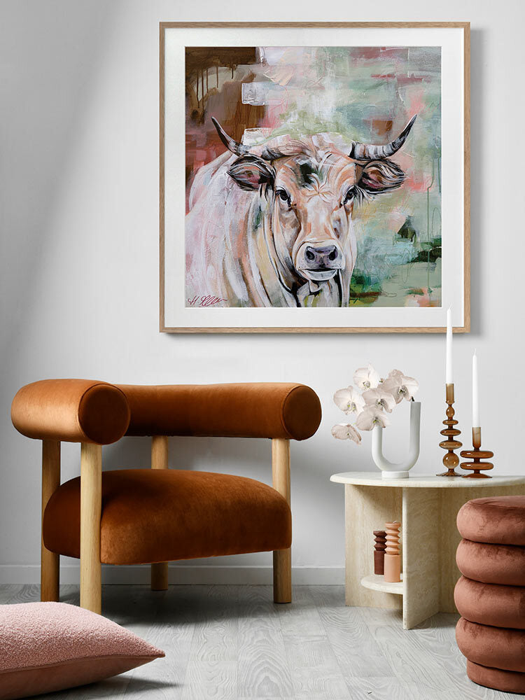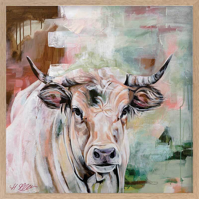 State Of Grace Brown Framed Art Print - Representing strength and boldness, this is a truly captivating piece that brings plenty of character to your space. Capturing a curious stare, this depiction of a wild bull uses a versatile colour palette of warm brown shades, complemented by soft green and red tones.