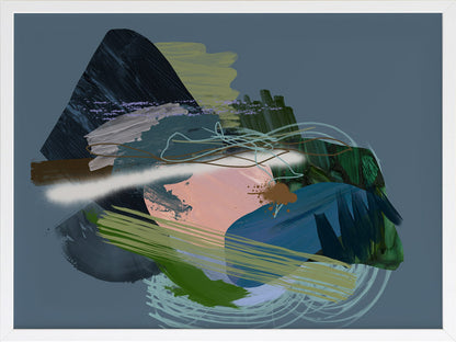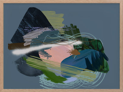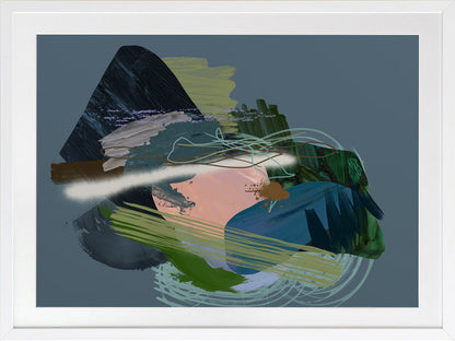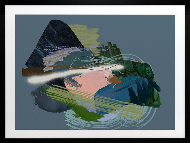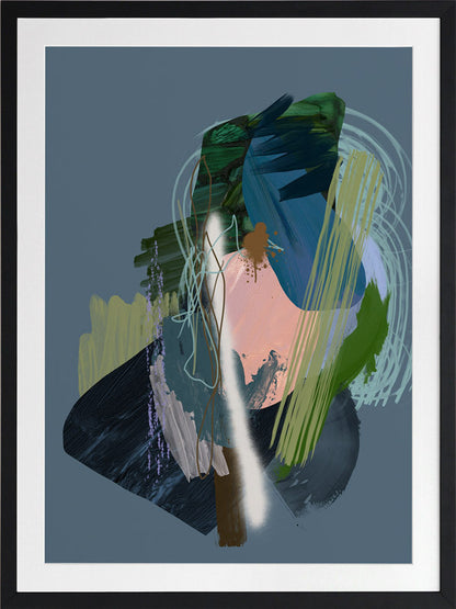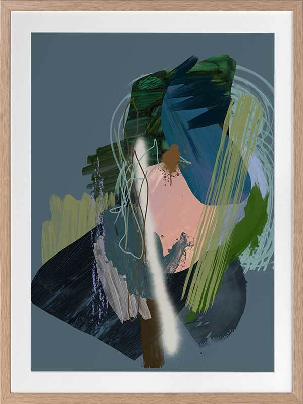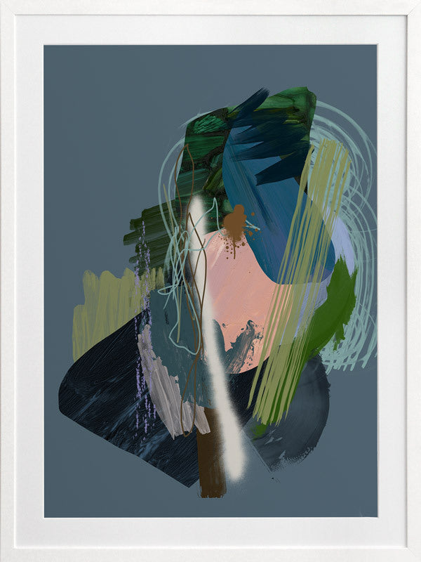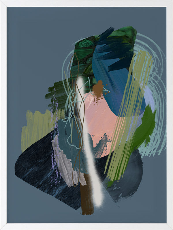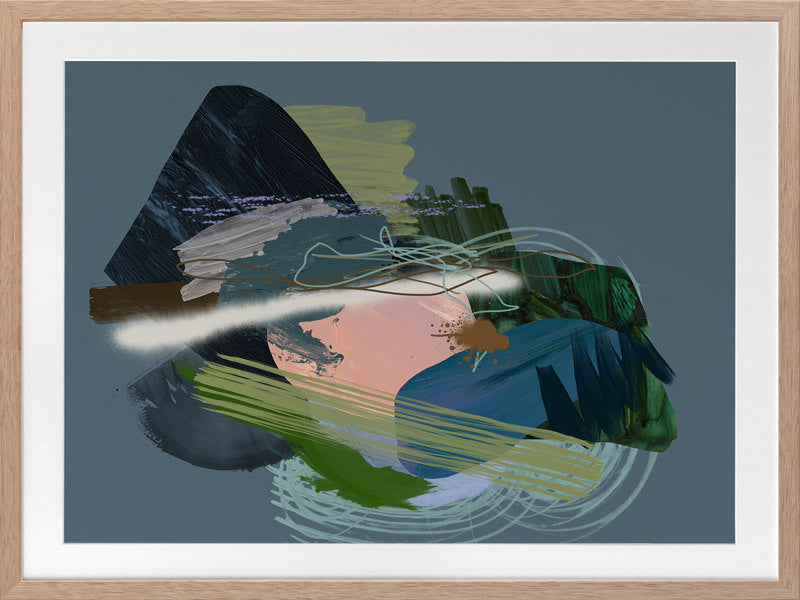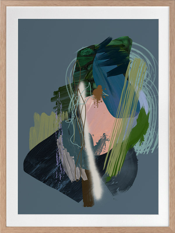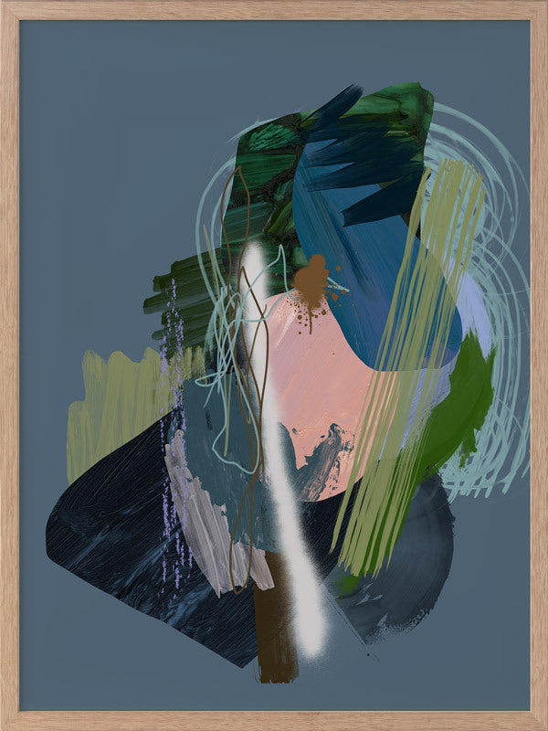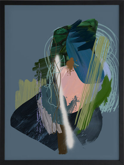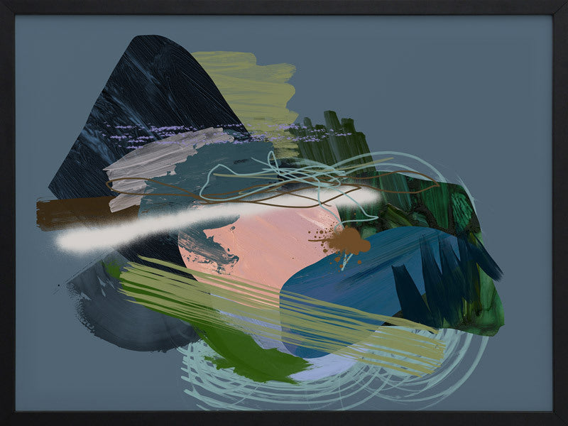 Stitch Framed Print: A dark, moody abstract that overlays different textural elements, including paint strokes, spray paint and scribbles. Features a dark green and blue colour palette, with a pop of coral, against a dark smoky blue background. 2019 SPRING/SUMMER COLLECTION: SOLSTICE
