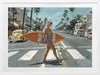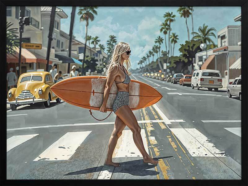 Stopping Traffic Framed Art Print - Sunshine, palm trees, and the cool edge of California surf culture come to life in this striking piece from Shaynna Blaze's exclusive designer collection. A fashionable surfer girl casually struts across the street, her orange surfboard tucked under her arm, embodying both the essence of glamour and retro style. This vibrant artwork draws from the golden era of coastal living, merging vintage tones with modern fashion. A limited edition, it is ideal for those seeking a statement piece that speaks of both adventure and sophistication, whether for the living room, bedroom, or beyond.