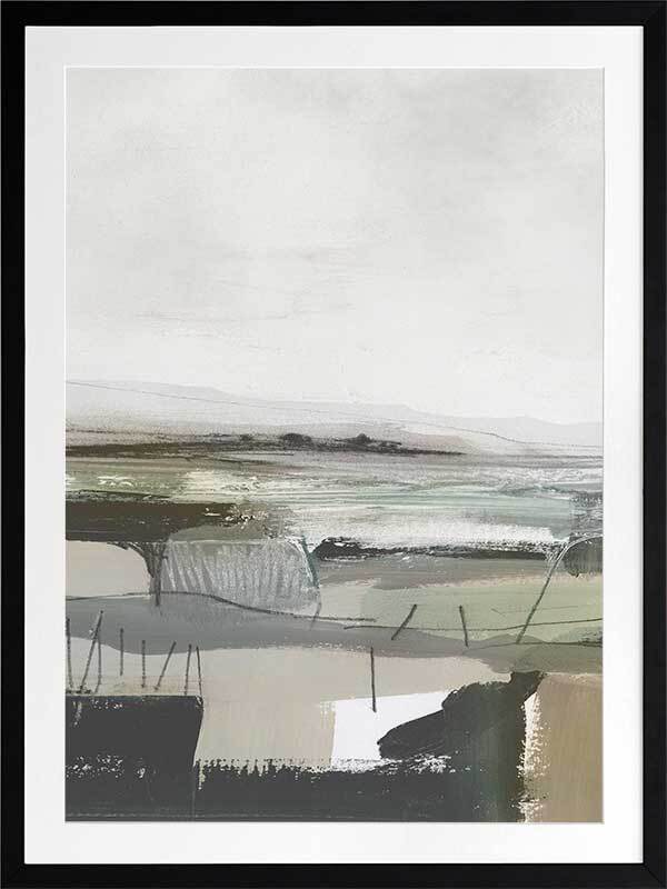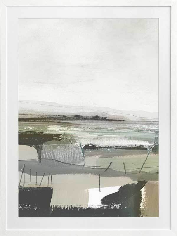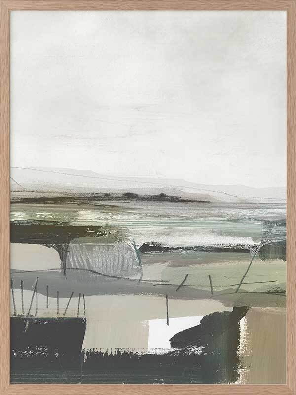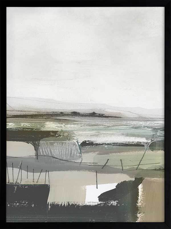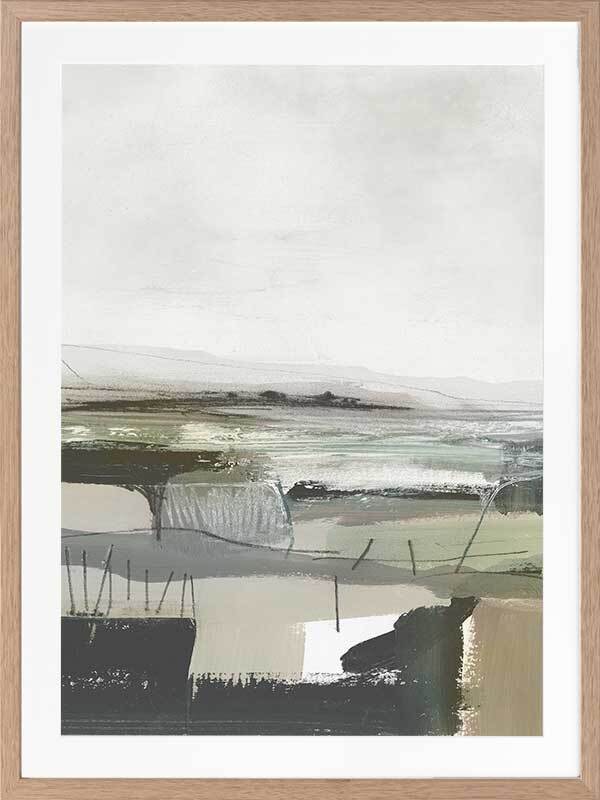 Sublime Vista I Framed Art Print - This creative, abstract artwork reflects a very moody dark landscape, created with varying shades of green. Moss and olive tones are repeated throughout with contrasting grey and white for the landscape gradient. Want a complete set? Pair with our Sublime Vista II for a cohesive set.