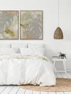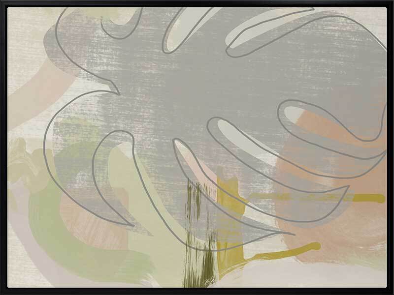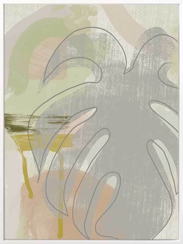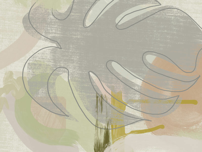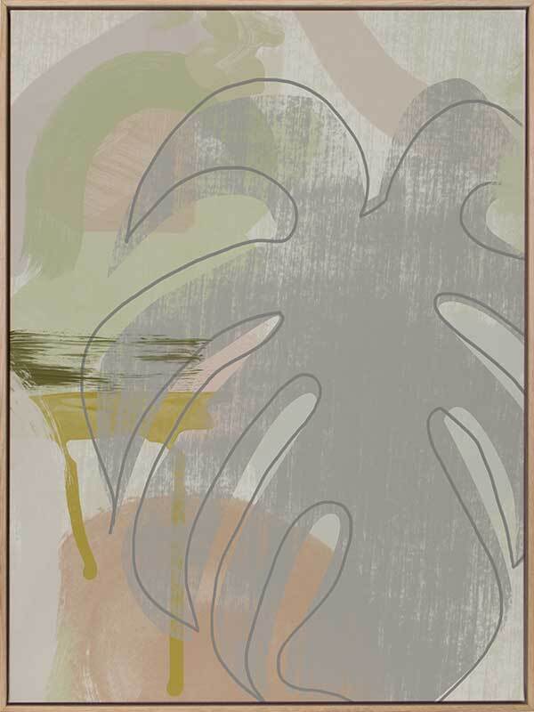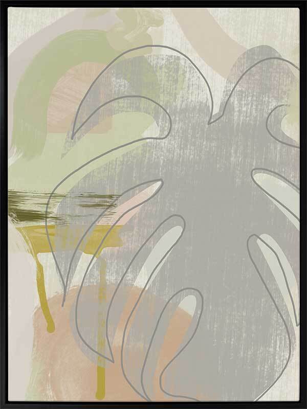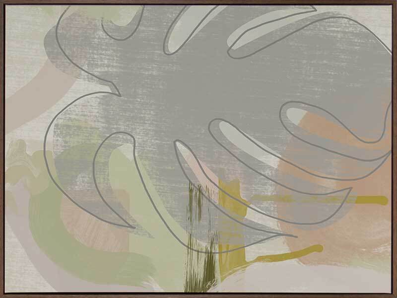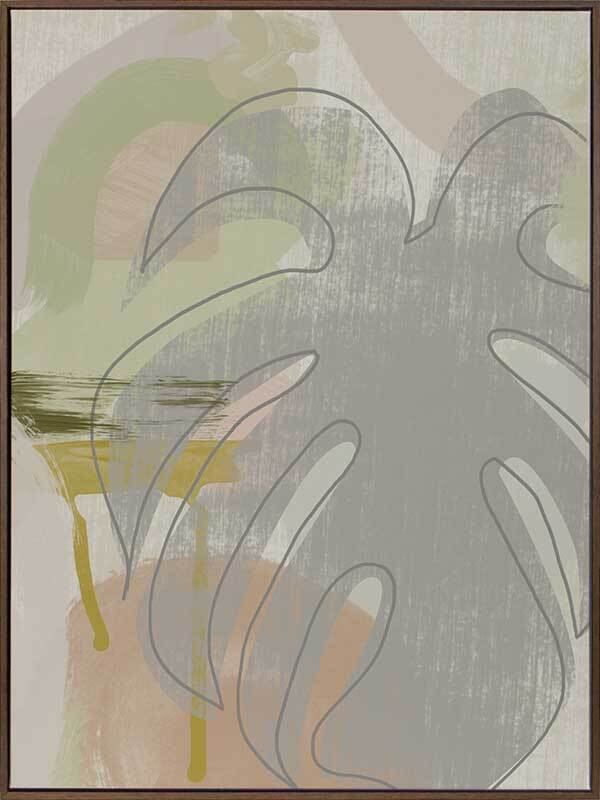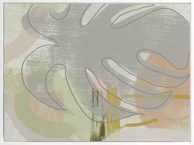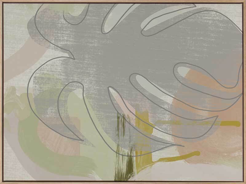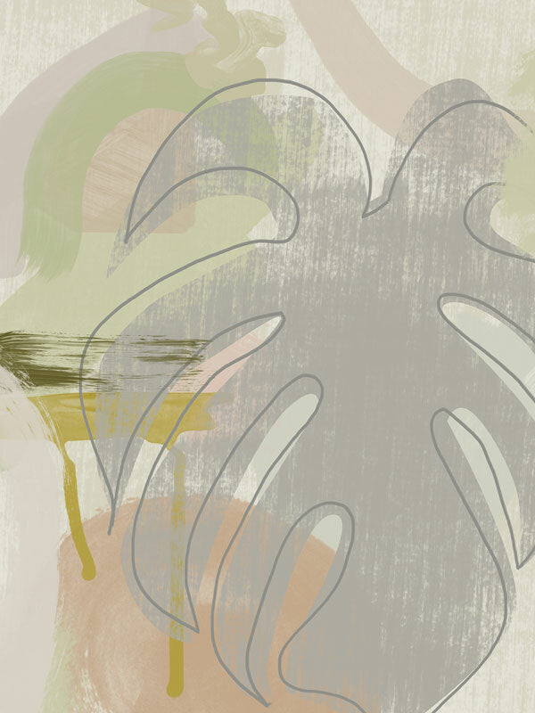 Subtropica II Canvas Art Print: A light, earthy artwork that features a grey, distressed monstera leaf overlaying green, beige and nude strokes and shapes. Pairs with Subtropica I. 2019 AUTUMN/WINTER COLLECTION: ODYSSEY