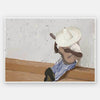 Sueños musicales Landscape Unframed Art Print - In the midst of a sweet melody, he nods off, swept away in a musical dreamscape. Reminiscent of the streets of Latin America, this artwork is a true statement piece for any interior style with a plain grey and warm-brown background, making the figure's indigo blue stripey pants pop in the foreground. Other tones include deep brown, light beige, and a hint of khaki green.