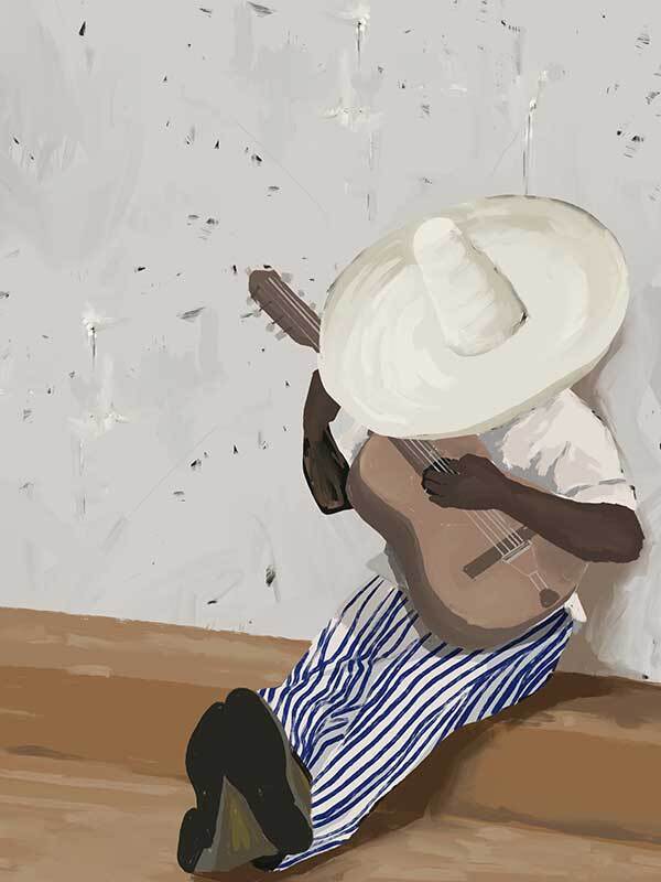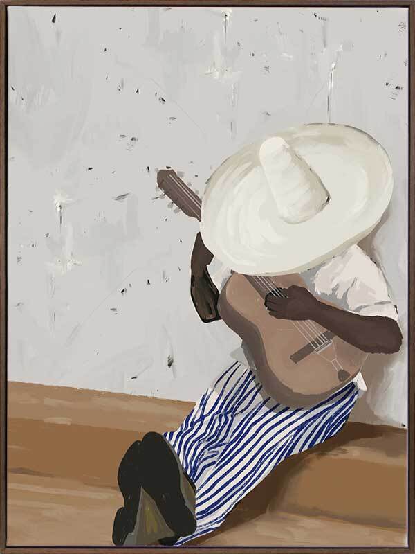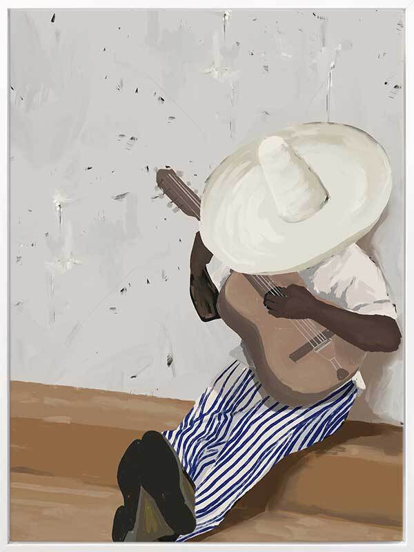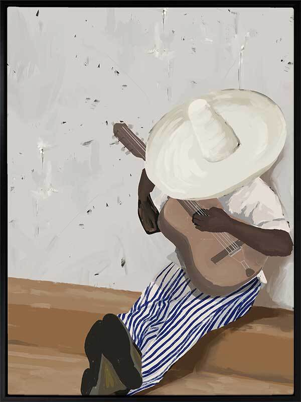 Sueños musicales Portrait Canvas Art Print - In the midst of a sweet melody, he nods off, swept away in a musical dreamscape. Reminiscent of the streets of Latin America, this artwork is a true statement piece for any interior style with a plain grey and warm-brown background, making the figure's indigo blue stripey pants pop in the foreground. Other tones include deep brown, light beige, and a hint of khaki green.