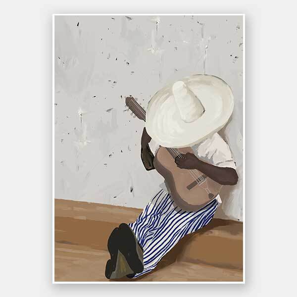 Sueños musicales Portrait Unframed Art Print - In the midst of a sweet melody, he nods off, swept away in a musical dreamscape. Reminiscent of the streets of Latin America, this artwork is a true statement piece for any interior style with a plain grey and warm-brown background, making the figure's indigo blue stripey pants pop in the foreground. Other tones include deep brown, light beige, and a hint of khaki green.