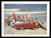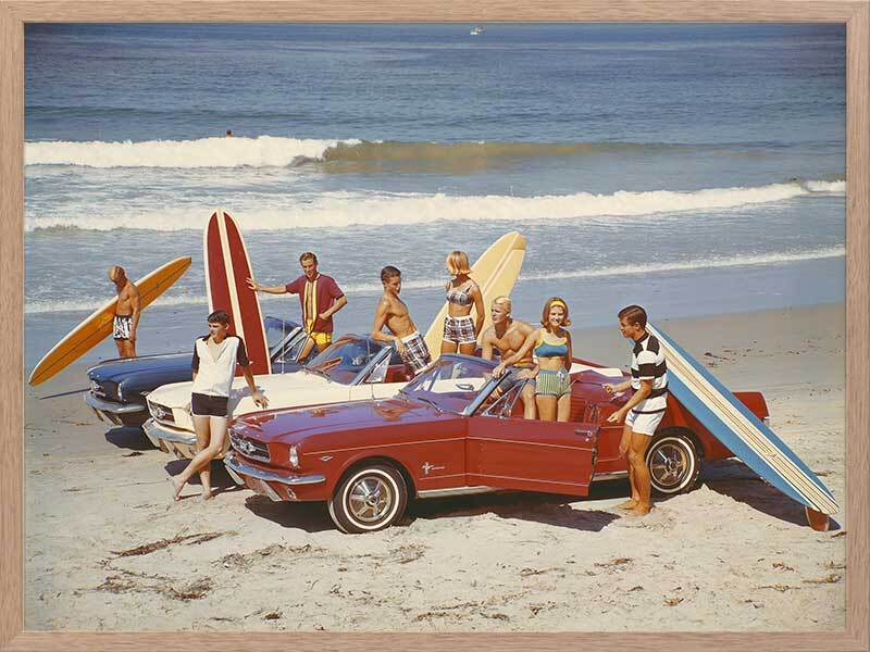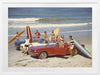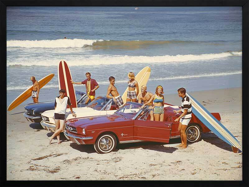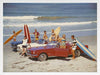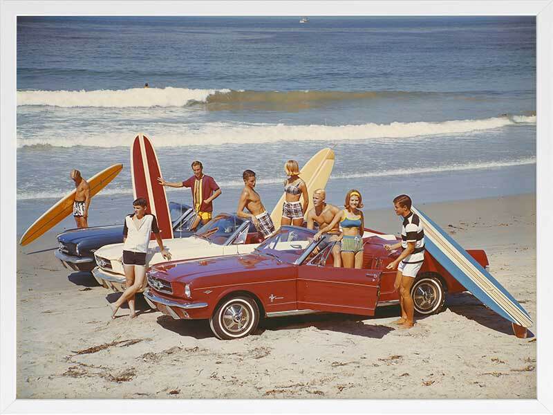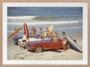 Summer Beach Ride III Framed Art Print - For the ultimate nostalgic feeling, you'll be transported back to the days of convertibles and vintage swimwear with this photographic artwork. Featuring three parked convertible cars on a beach with a group of friends in swimwear leaning on and around the car with their surfboards. The colour palette is multicoloured with vibrant yellows, reds, and blues from the surfboards, swimwear and cars. Pairs well with Summer Beach Ride I and II.