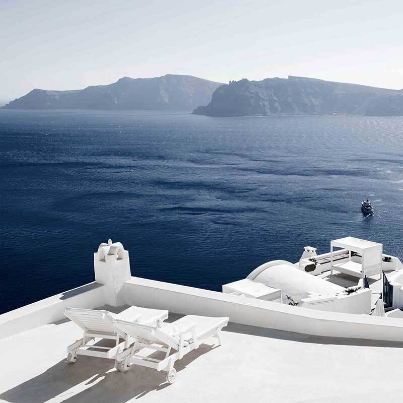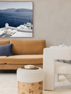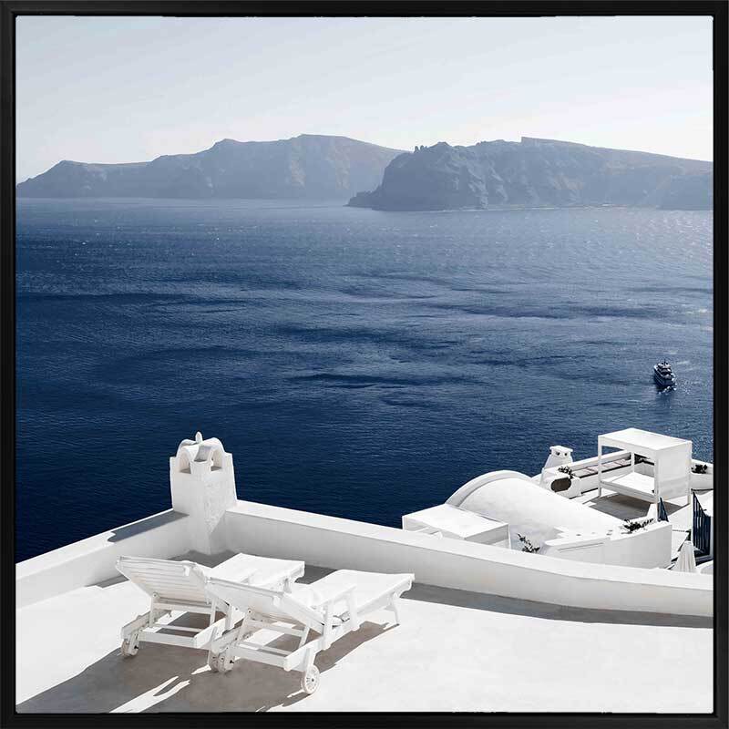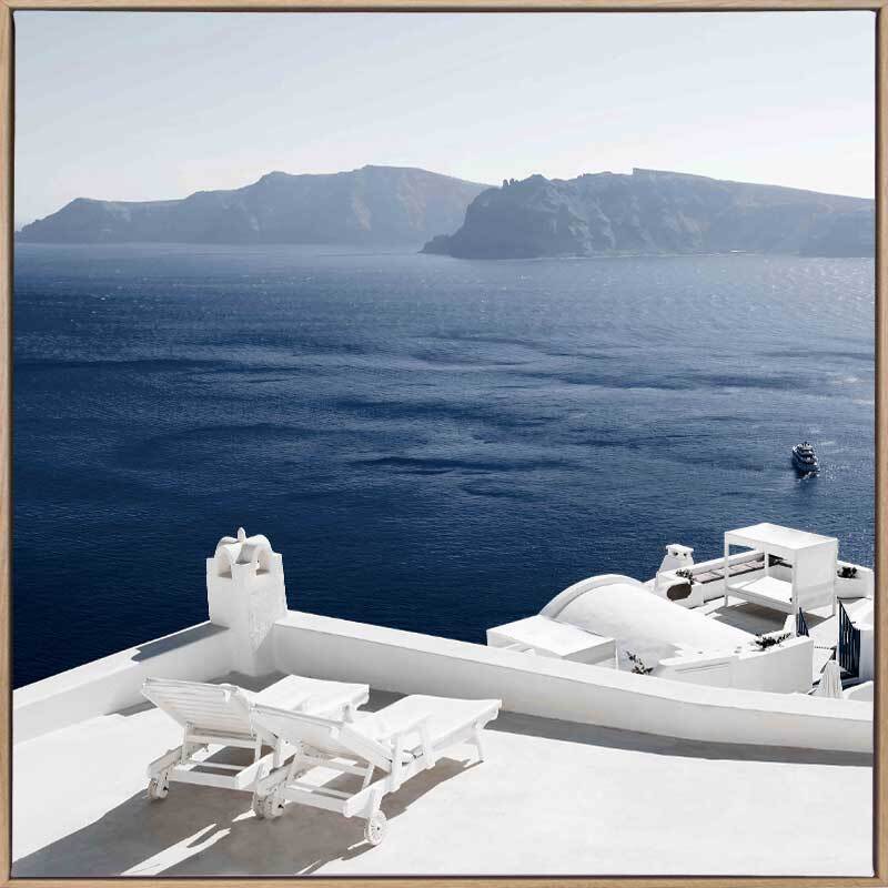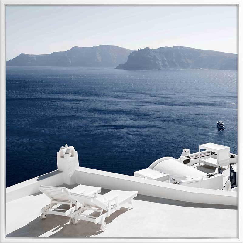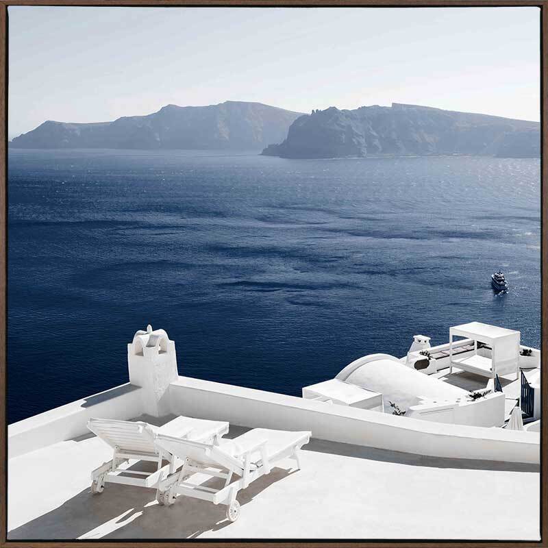 Summer Luxuries Canvas Art Print - Bring depth and character to your space with this calming photographic wall art, featuring a luxury coastal resort with lounge chairs overlooking the big blue ocean and mountains. Palette is simple with blues and fresh white shades that will have you wanting to travel to Greece.