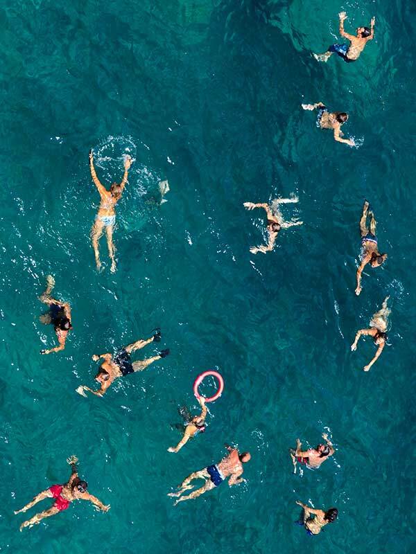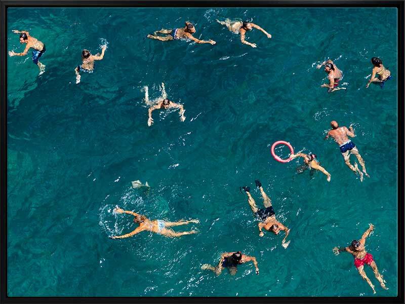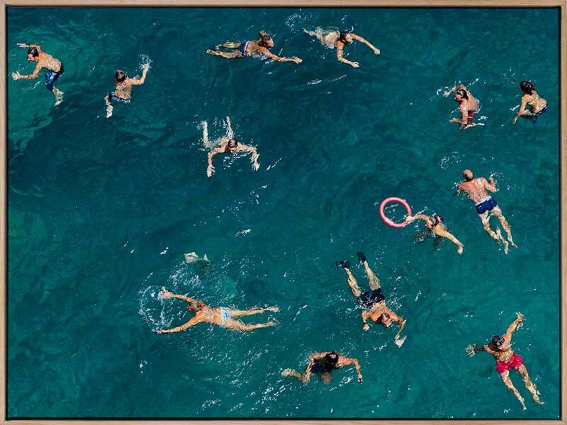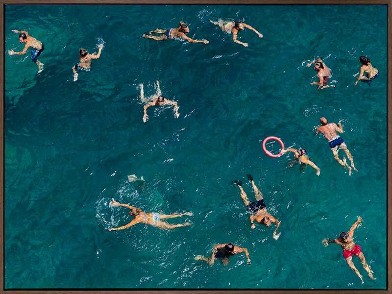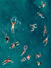 Summertime Floating Art Print - This photographic art print really makes a splash! An aerial view of a group of people frolicking about in the ocean an a gorgeous summer day. The deep blue-green of the ocean really invites you to want to join in on the fun. This fun wall art print will have you longing for those long relaxing summer days and would look great in a blonde timber look box frame. A great addition for your coastal home. THE CURATED SERIES II A handpicked gallery of wall art photography that is daringly and quirky, these photographic pieces are exploding with richness of colour and texture.