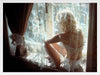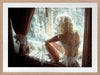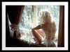 Sun-Kissed Mornings Framed Art Print - Giving retro fairy vibes, this photographic artwork captures a pensive moment of a woman by a window, bathed in soft morning light, lace curtains draped over her. A delicate interplay of light and dark neutral shades gives this wall art an ethereal, calming feel, with a retro, mid-century modern touch.