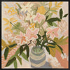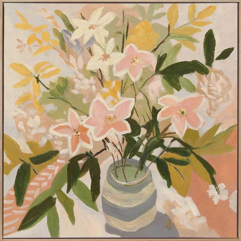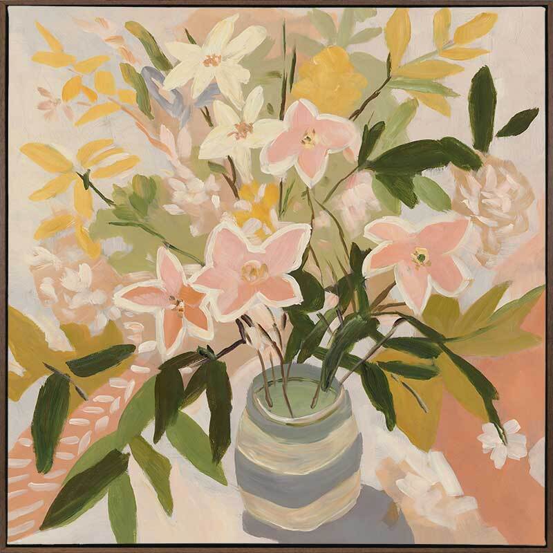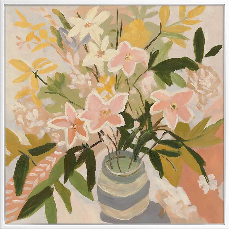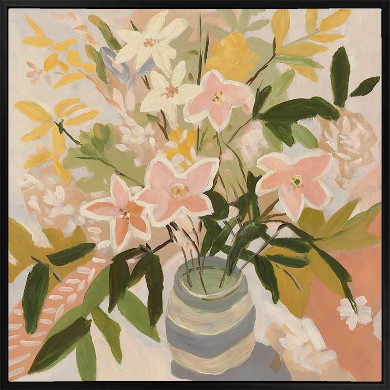 Sunlit Bouquet Canvas Art Print - This floral artwork is a joyful burst of colour, capturing the tender warmth of a sunlit bouquet within a blue-and-white striped vase. Gentle shades of peach, cream, and subtle yellows emerge amidst verdant strokes, creating a dance of colour and light.