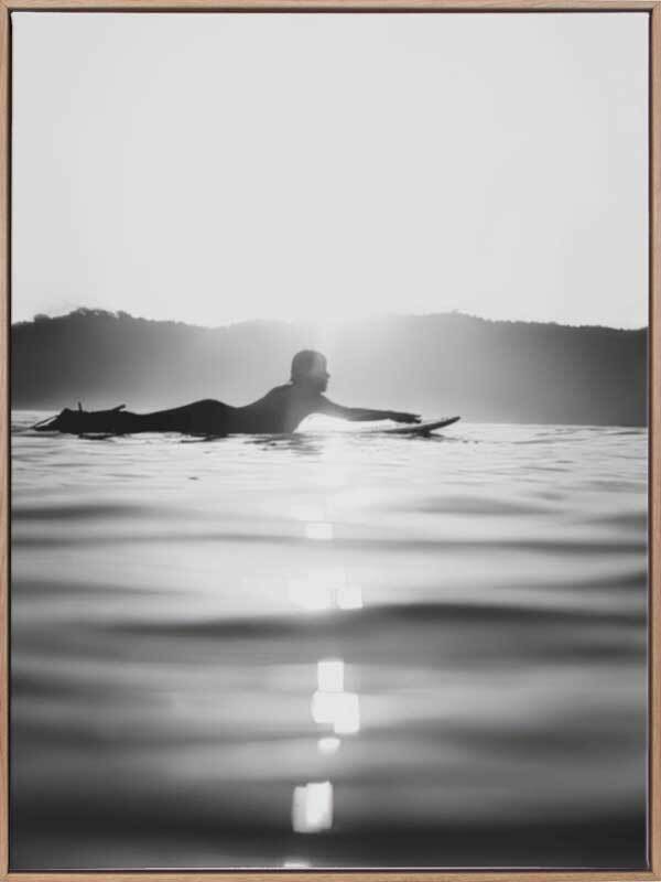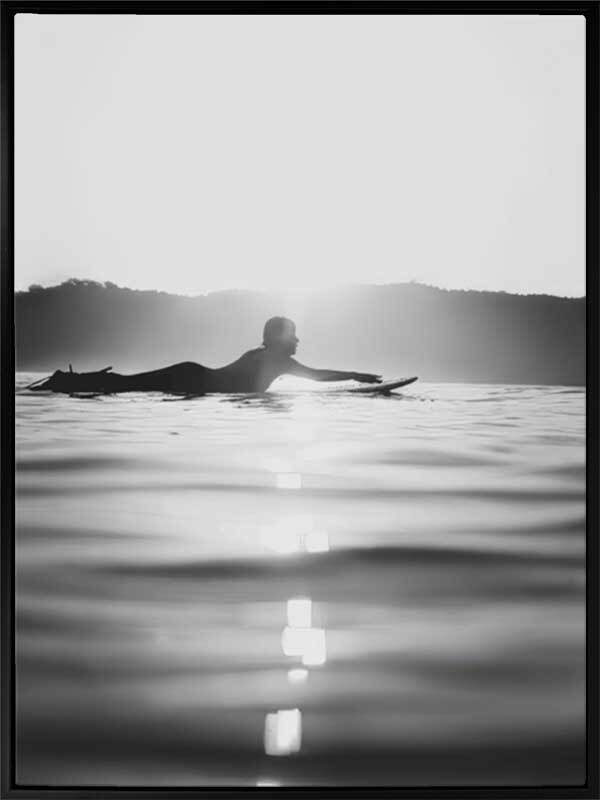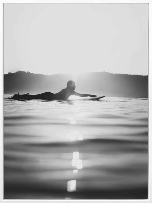 Sunrise Surfer Canvas Art Print - Embrace the serene beauty of dawn with this stunning photographic black-and-white wall print. Featuring a lone surfer paddling out to sea as the sun rises, this piece captures the tranquil and reflective mood of early morning. Ideal for lovers of travel, coastal vibes, and vintage photography.