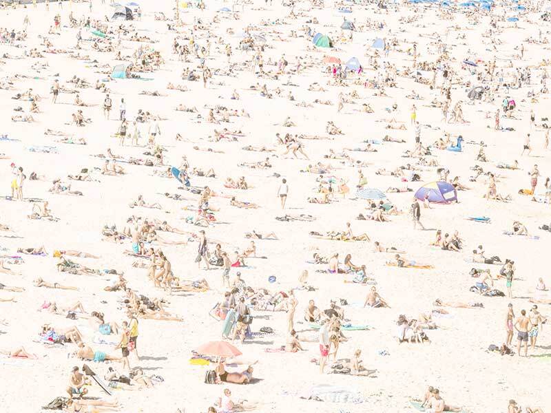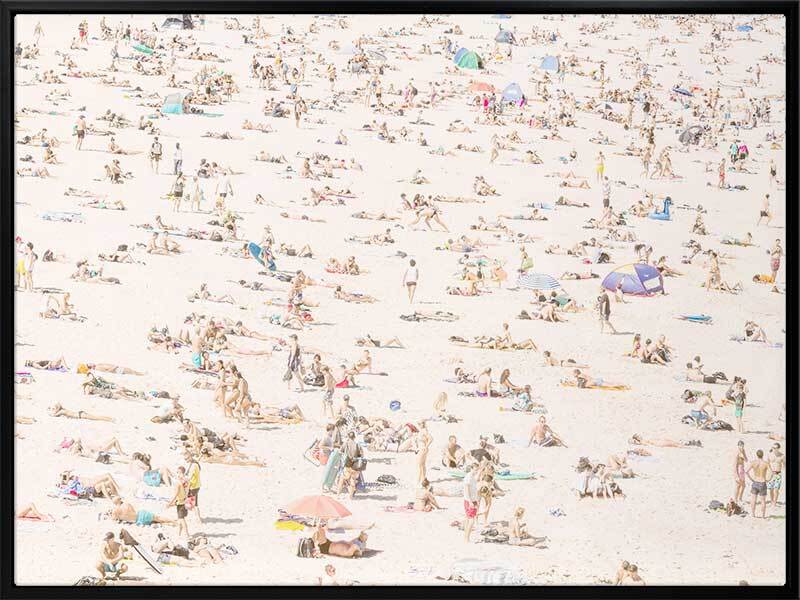 Sun's Out Canvas Art Print - This playful and interesting photographic artwork features a wide sandy beach full of people. The colour palette is light, bright and airy, with lots of pastel tones set against a soft nude background.