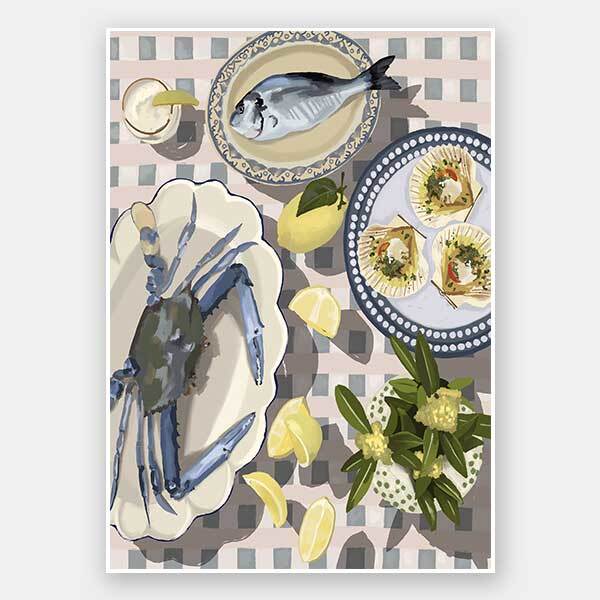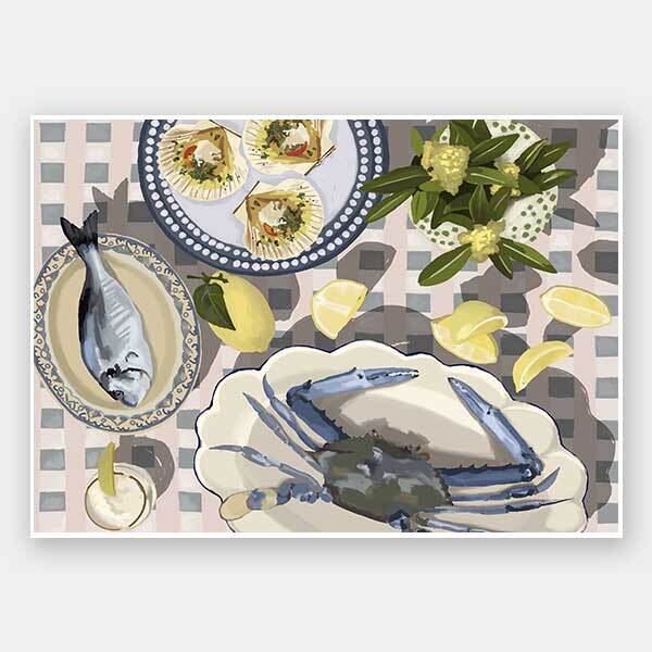 Sunset Feast Unframed Art Print - As the sun begins to set, endless varieties of seafood make their way out onto the alfresco table, casting shadows onto the checkerboard tablecloth as a reminder to eat while it's fresh. Crabs, scallops and fish are honoured with delicate porcelain plates, slices of lemon waiting for their moment to bring the meal together. A soft palette featuring pastel yellow, blue, lilac, green and white makes this a versatile piece for any room.