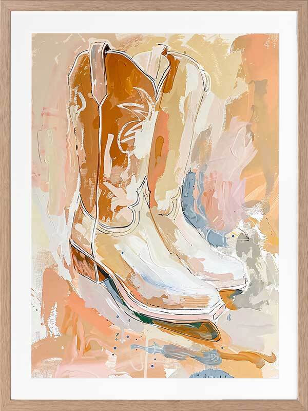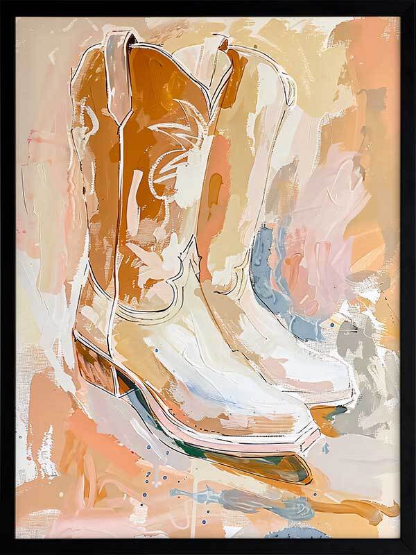 Sunset Stroll Framed Art Print - These cowboy boots were left out at sunset and they're basking in all that warm, golden light. Rendered in an expressive style with visible brush strokes and a textured design, this American Western-themed artwork features a caramel palette of orange and pink shades, evoking a sense of warmth and comfort.