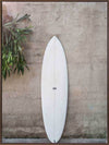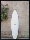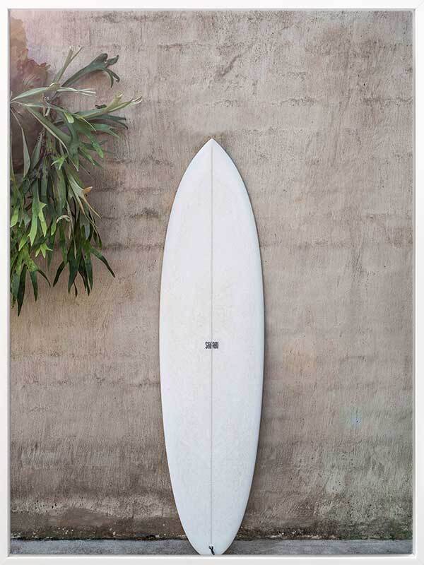 Surfboards & Sun Canvas Art Print - Surf's up. This coastal photographic art print is perfect for every surf lover and travel fan, featuring a surfboard perched against a wall. Palette is minimalist with beige, white, and green shades from the tree leaves peaking in from the side.