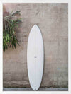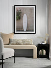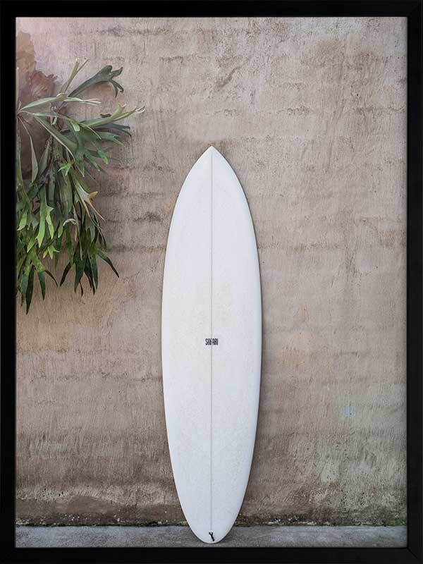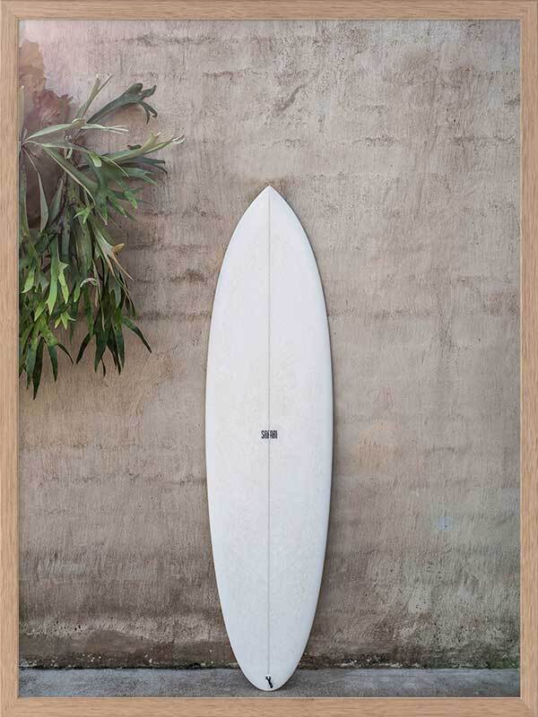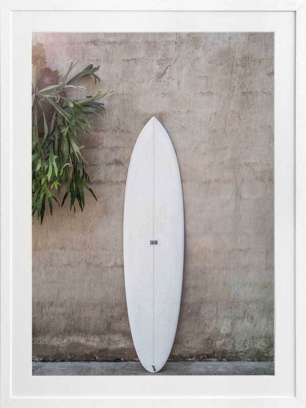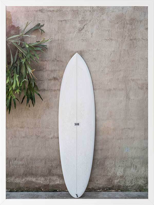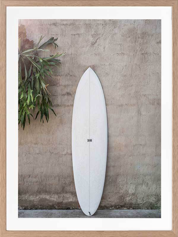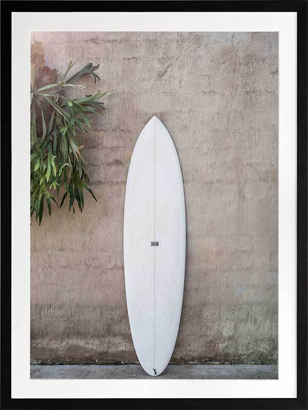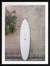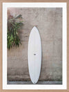 Surfboards & Sun Framed Art Print - Surf's up. This coastal photographic art print is perfect for every surf lover and travel fan, featuring a surfboard perched against a wall. Palette is minimalist with beige, white, and green shades from the tree leaves peaking in from the side.