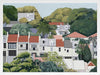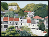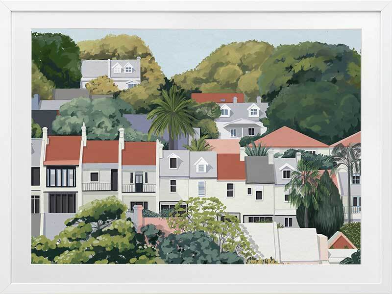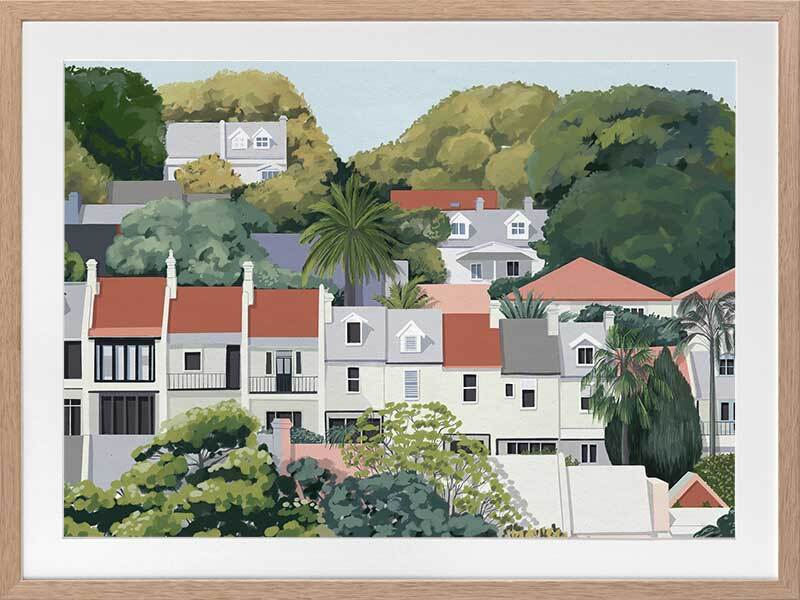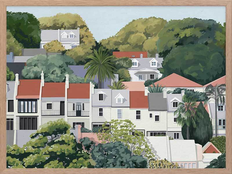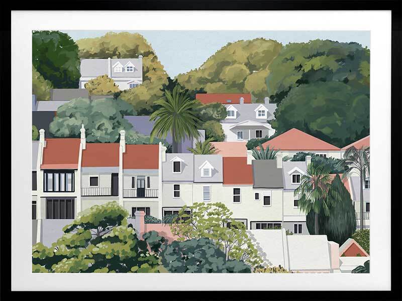 Surry Hills Framed Art Print - A calm, sophisticated and beautifully balanced illustration featuring rows of townhouses sitting a top a lush, leafy green hillside.