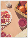 Sweet Nectar Canvas Art Print - The sun is beating down as a plate of freshly sliced blood red oranges are placed onto the table, ready to enjoy propped onto the edge of a cold glass of the very same juice. Playing with light and shadow, this gorgeous piece uses vivid shades of jewel-toned red and bright orange, softened by a mellowed peach colour for the table, and some white and yellow shades to make it all pop.