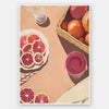Sweet Nectar Unframed Art Print - The sun is beating down as a plate of freshly sliced blood red oranges are placed onto the table, ready to enjoy propped onto the edge of a cold glass of the very same juice. Playing with light and shadow, this gorgeous piece uses vivid shades of jewel-toned red and bright orange, softened by a mellowed peach colour for the table, and some white and yellow shades to make it all pop.