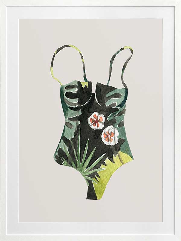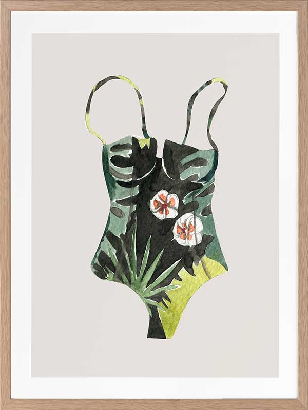 Swimsuit I Poster Print. An elegant one-piece swimsuit adorned with tropical plant images in various shades of green reminds us of long, lazy summers beside the pool. This piece works as a stand-along piece or is impressive when paired with Swimsuit II and Swimsuit III Posters.