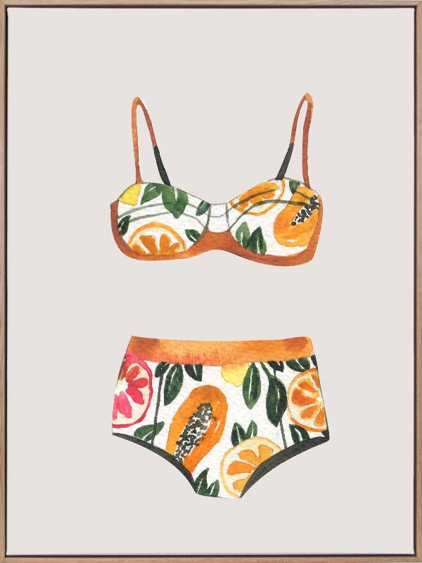 Swimsuit III Poster Print. Take your wall space up a notch with this refreshingly different bikini poster print featuring luscious tropical fruit with deep orange tones. This piece pairs perfectly with Swimsuit I and Swimsuit II