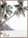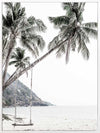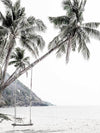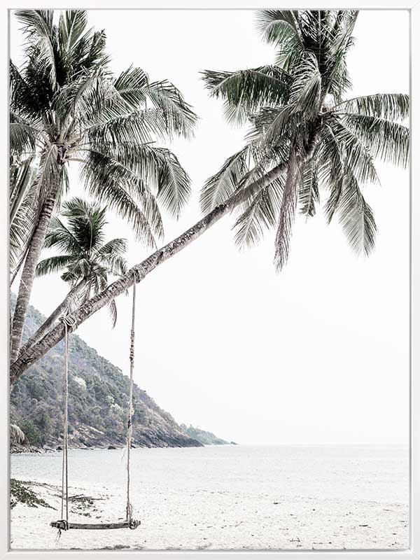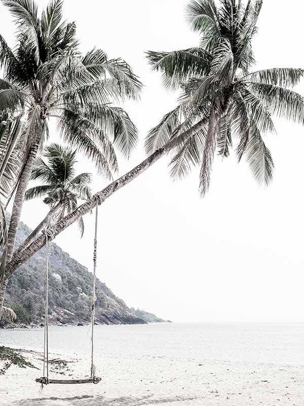 Swing Life Away - Make every day a holiday with this relaxed photographic print, featuring a rope swing hanging from a palm tree on a sandy beach overlooking the ocean.