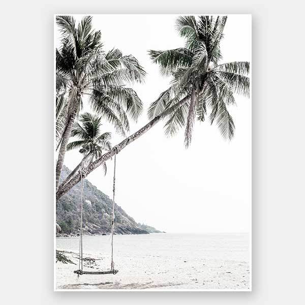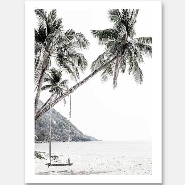 Swing Life Away - Make every day a holiday with this relaxed photographic print, featuring a rope swing hanging from a palm tree on a sandy beach overlooking the ocean.