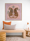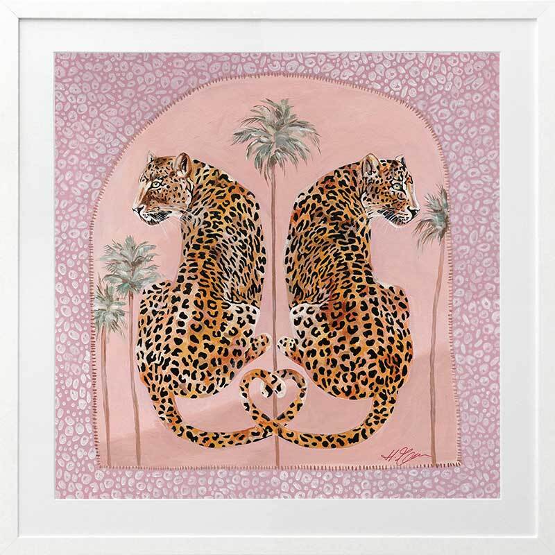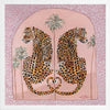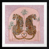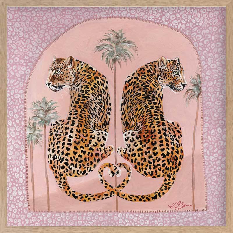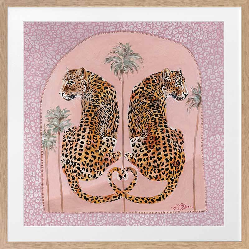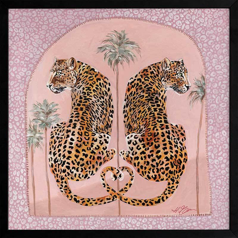 Synchronicity Pink Framed Art Print - Fun and inviting, this boho-inspired piece features two leopards side-by-side, enjoying a moment among the palm trees on a warm summer's night. A bright palette of pink tones, green, orange, and dark yellow complements funky shapes and patterns throughout the work.