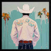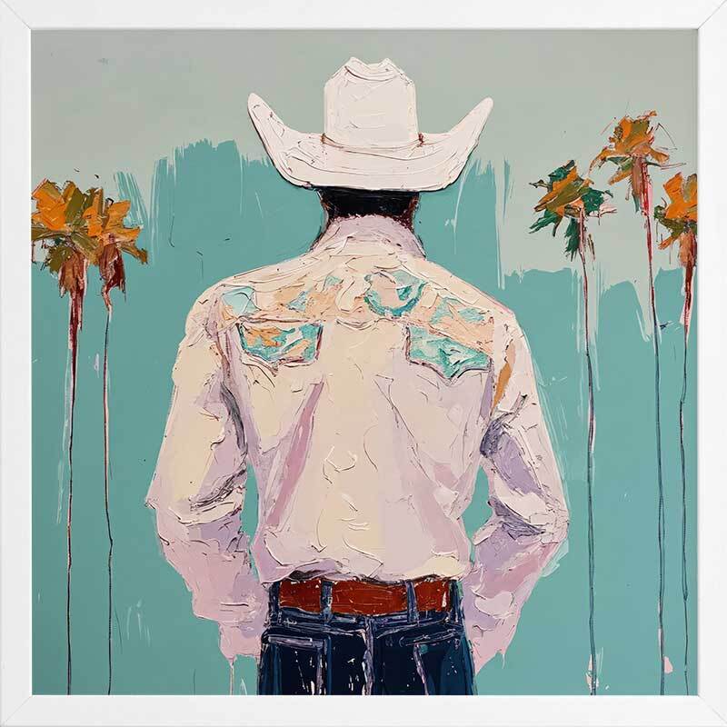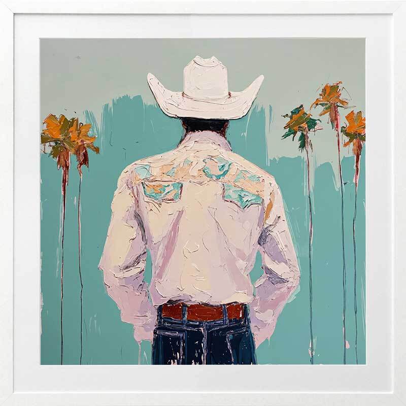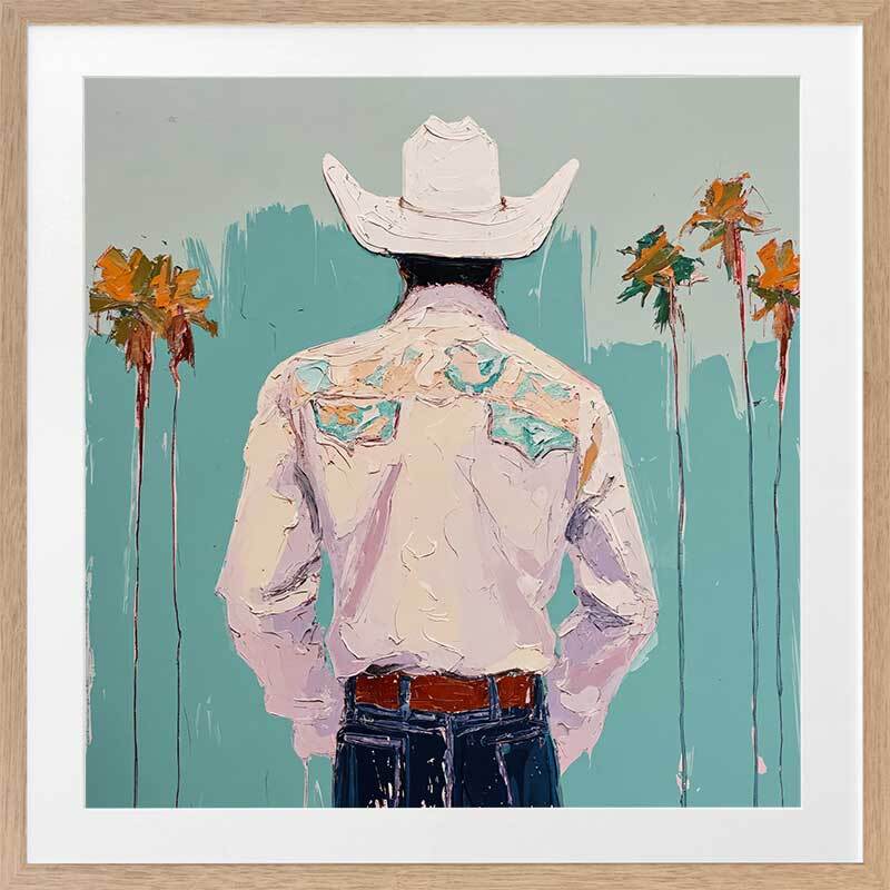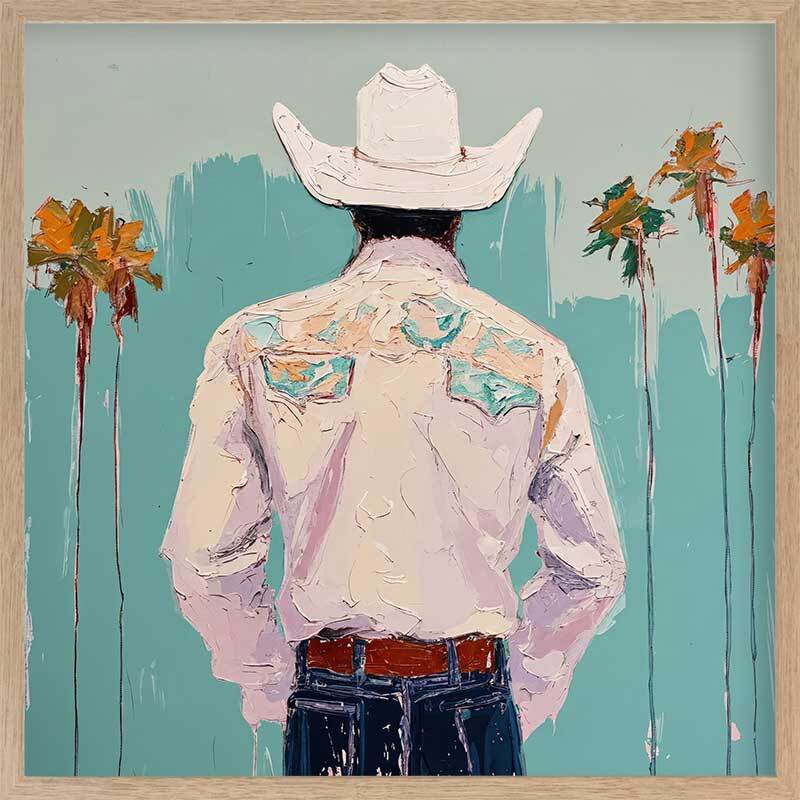 Take Me Home, Country Road I Framed Art Print - Steadfast and confident, this cowboy is a symbol of the wild and free energy of the Wild West, bringing the American country scene to life in a playful way. Against a textured backdrop of soft blue and bright oranges, he wears a classic cowboy hat, denim jacket, belt, and jeans.