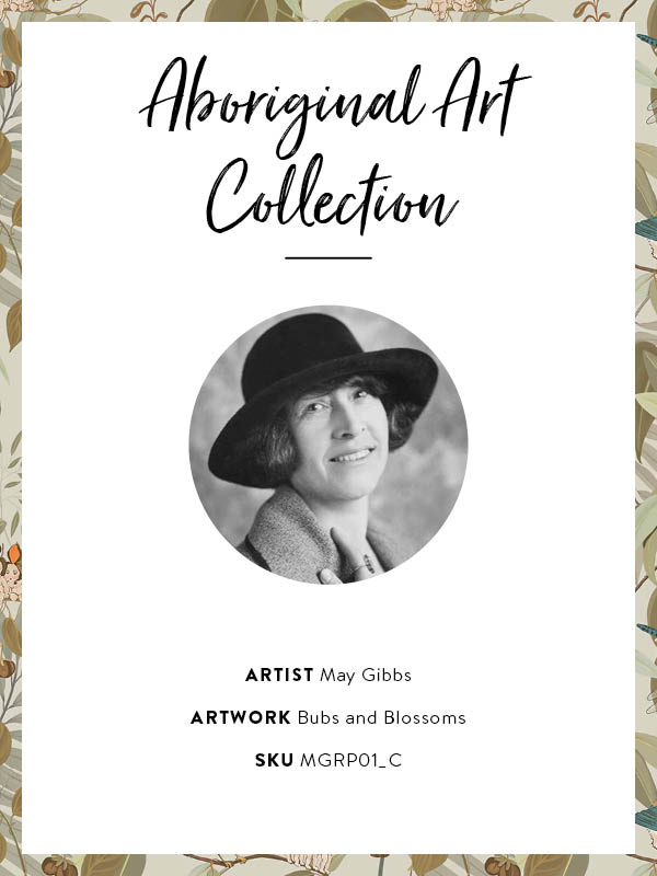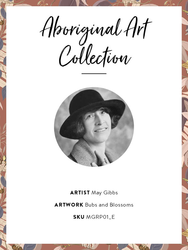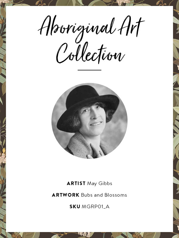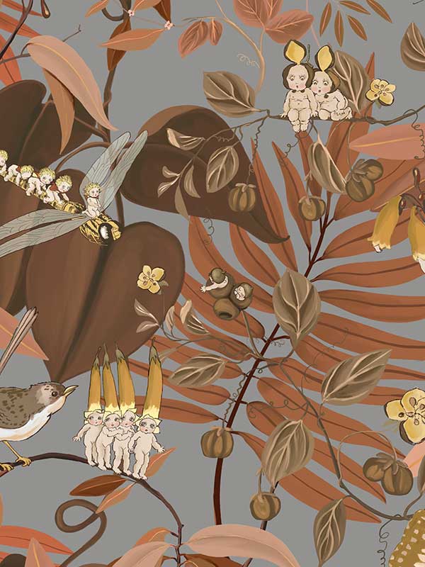 This wallpaper captures the spirit of May Gibbs illustrations with a fresh, contemporary twist. Choose from chocolate brown, beige, sage green, slate blue, dusty pink, and light brown.