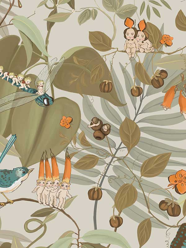 Tales of the Bushland Buddies Wallpaper - Elevate any space into an enchanting Australian bushland with the Urban Road X May Gibbs Wallpaper. This design from the exclusive collection is alive with whimsical characters like the beloved Gumnut Babies and Gum Blossom Babies nestled among vibrant flora. Inspired by May Gibbs artwork and her iconic illustrations, this wallpaper brings the natural charm of Australian landscapes to life, featuring native plants, delicate blooms, and intricate details of the country's unique flora and fauna from butterflies to birds.
