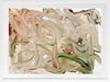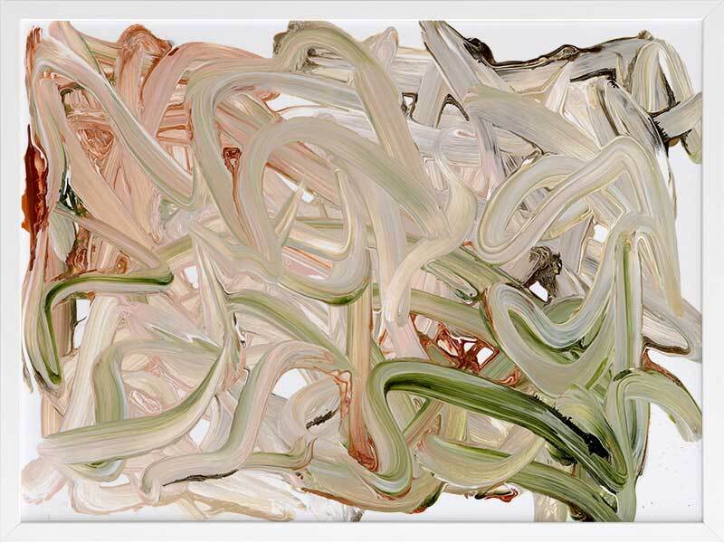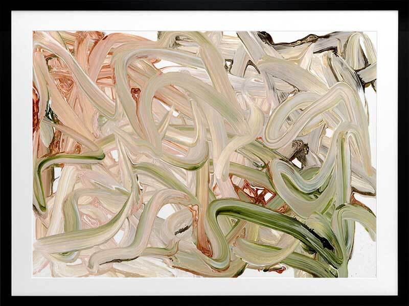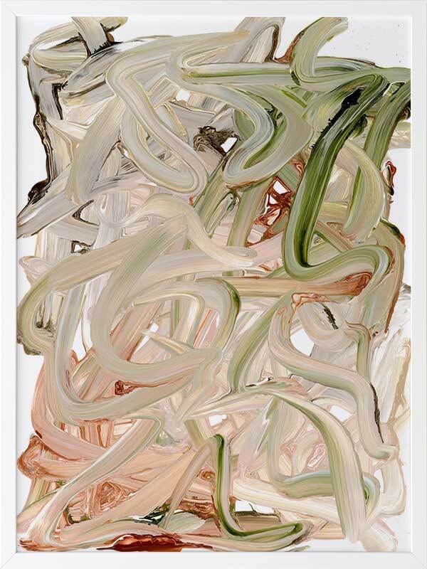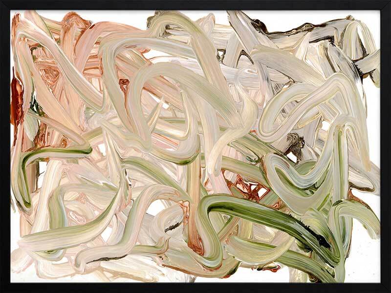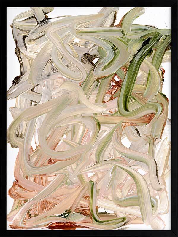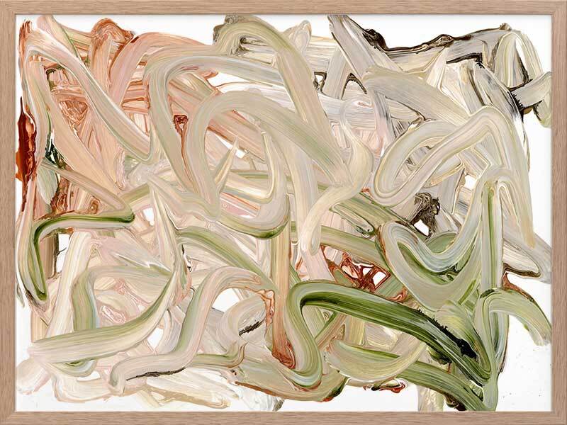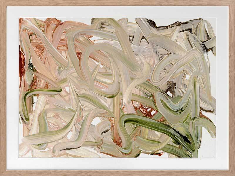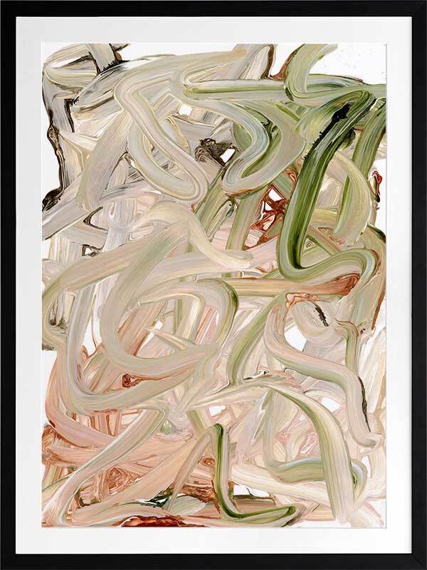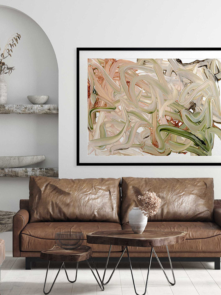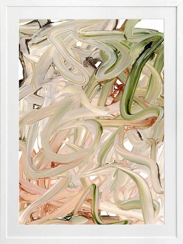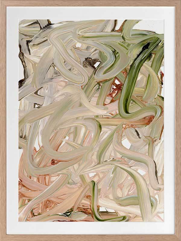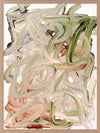 Tenor Framed Print: A playful abstract artwork that features a chaotic series of overlapping beige, green and rust coloured brushstrokes. 2020 AUTUMN/WINTER COLLECTION: REVERIE
