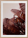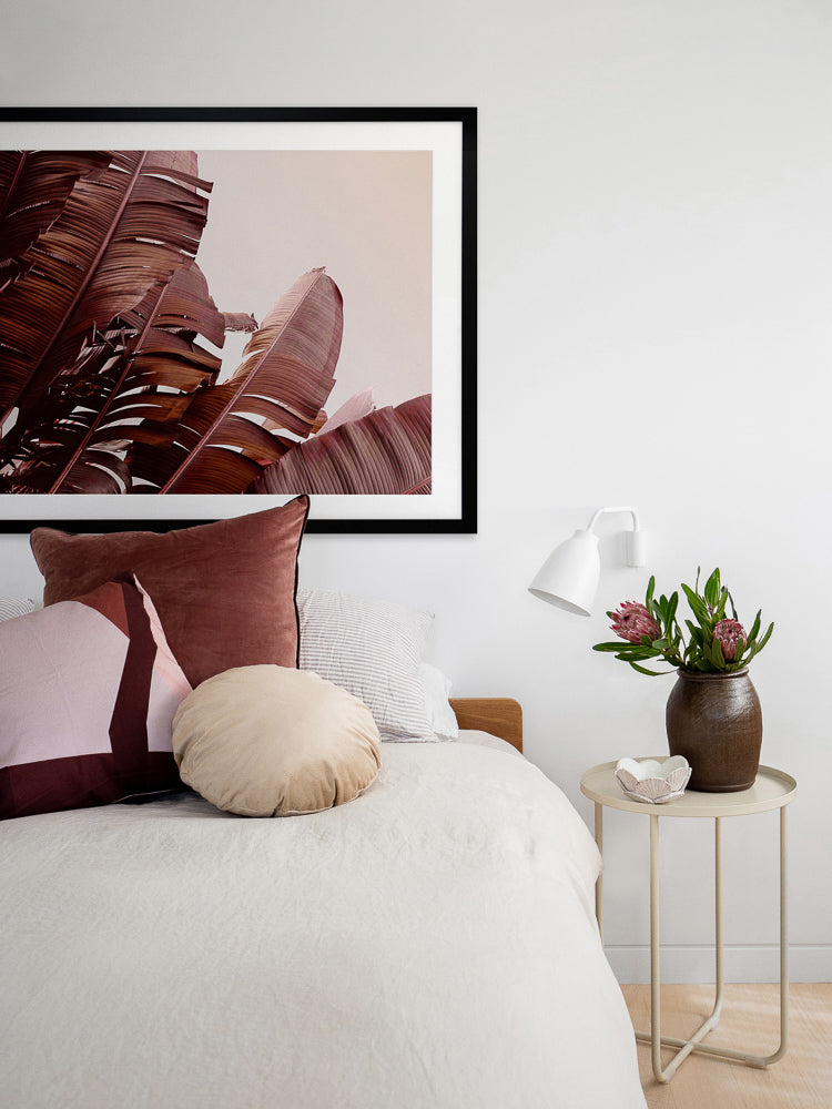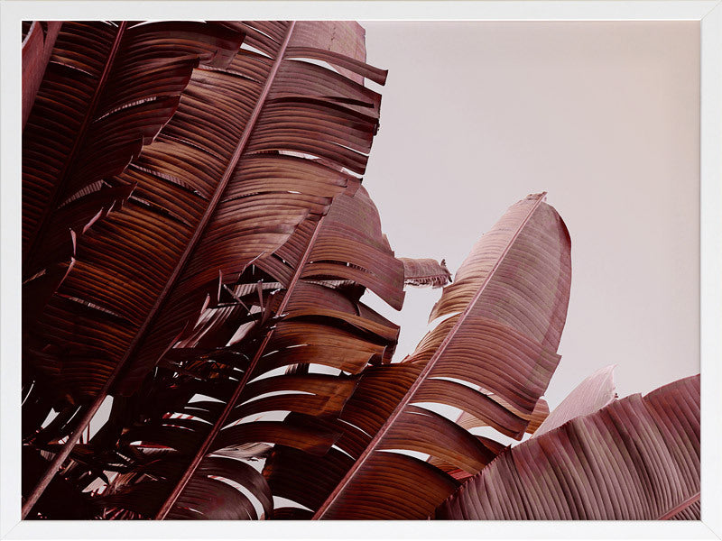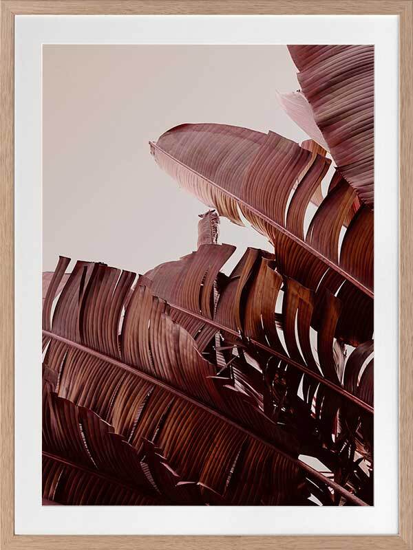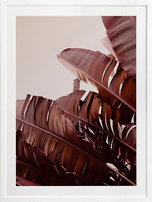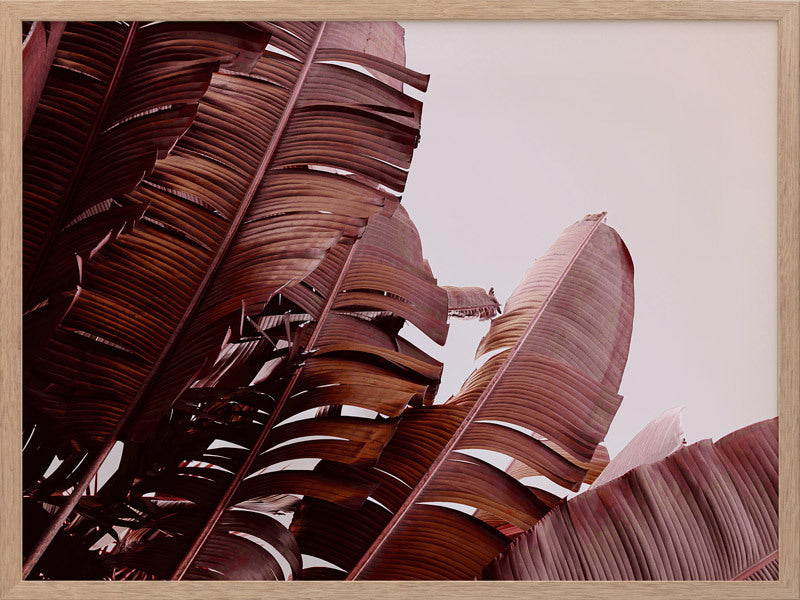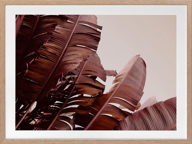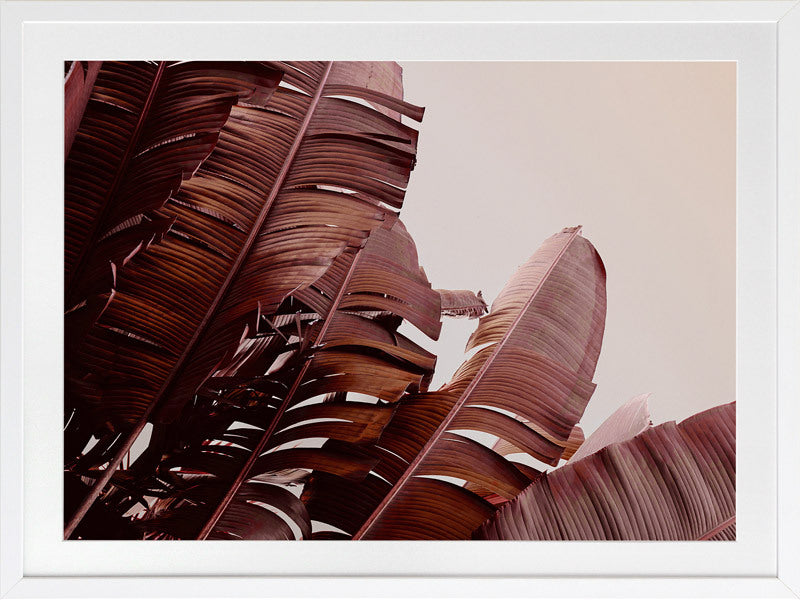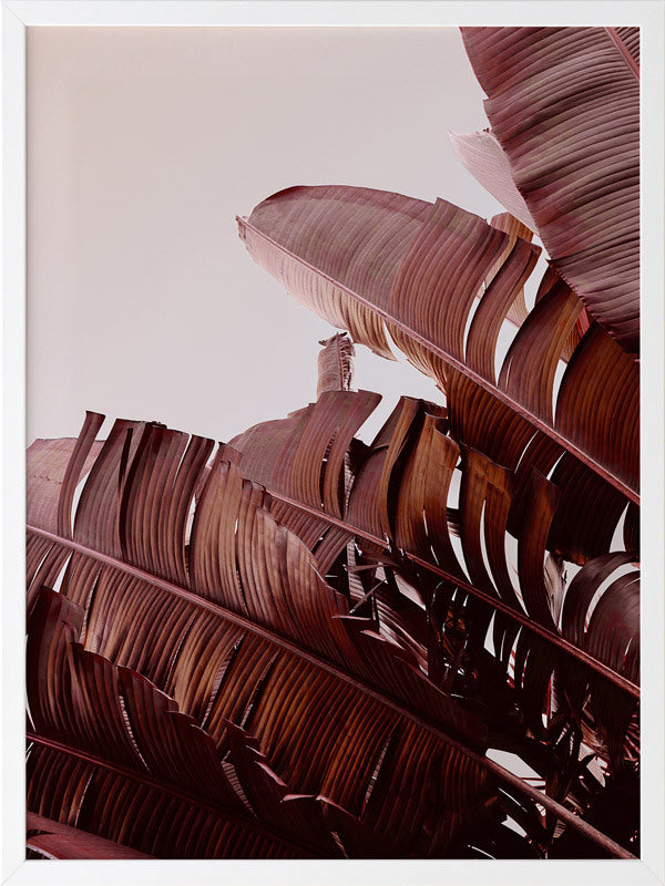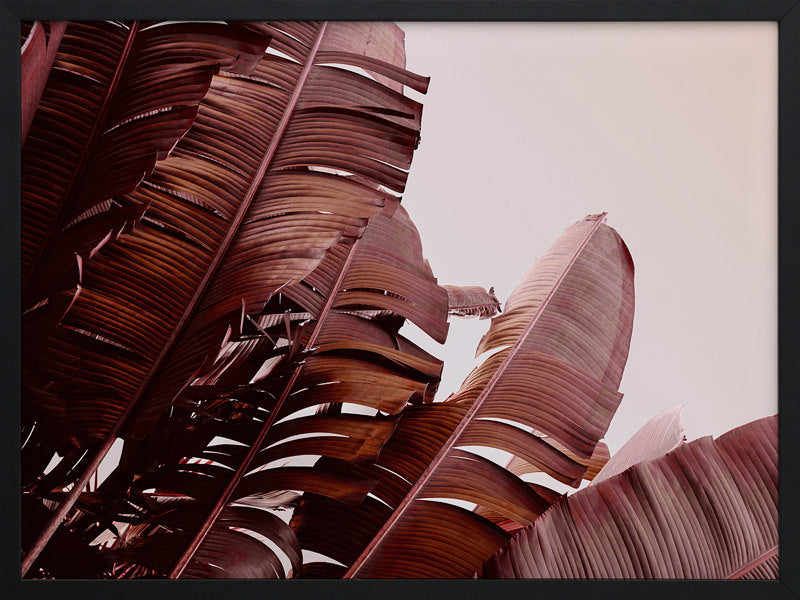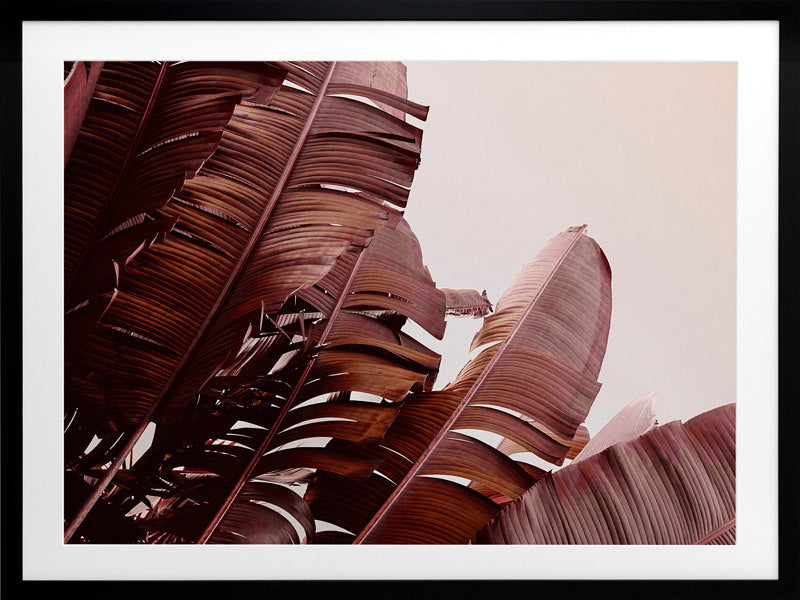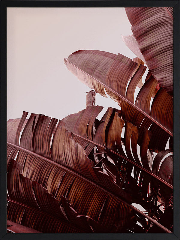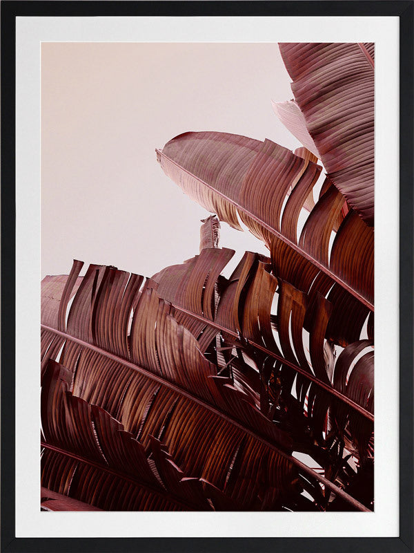 Tequila Sunrise Framed Print: A close-up, burgundy-toned photograph of a banana palm against a soft pink sky. 2019 SPRING/SUMMER COLLECTION: SOLSTICE