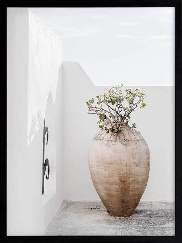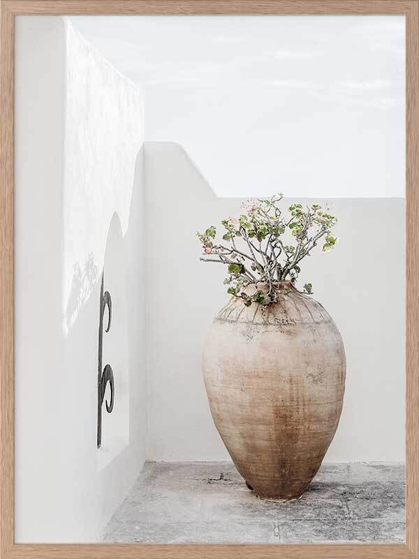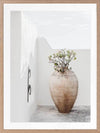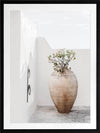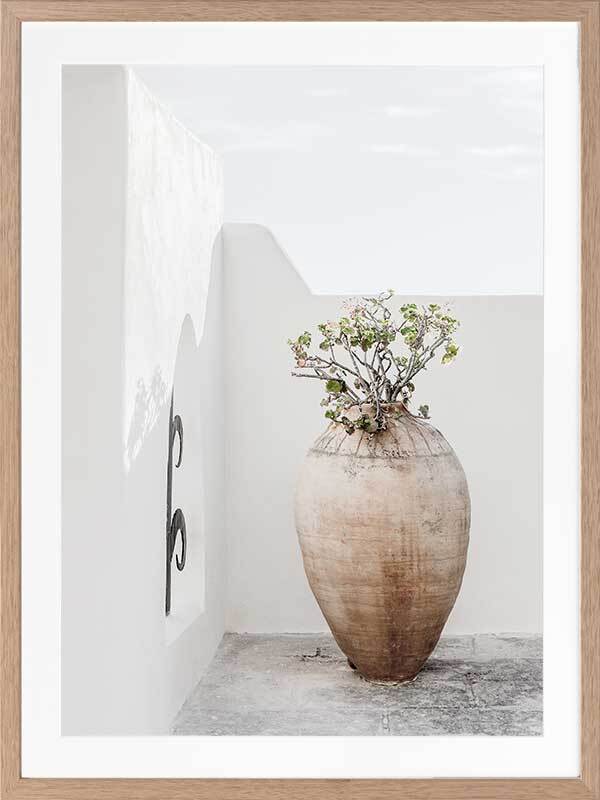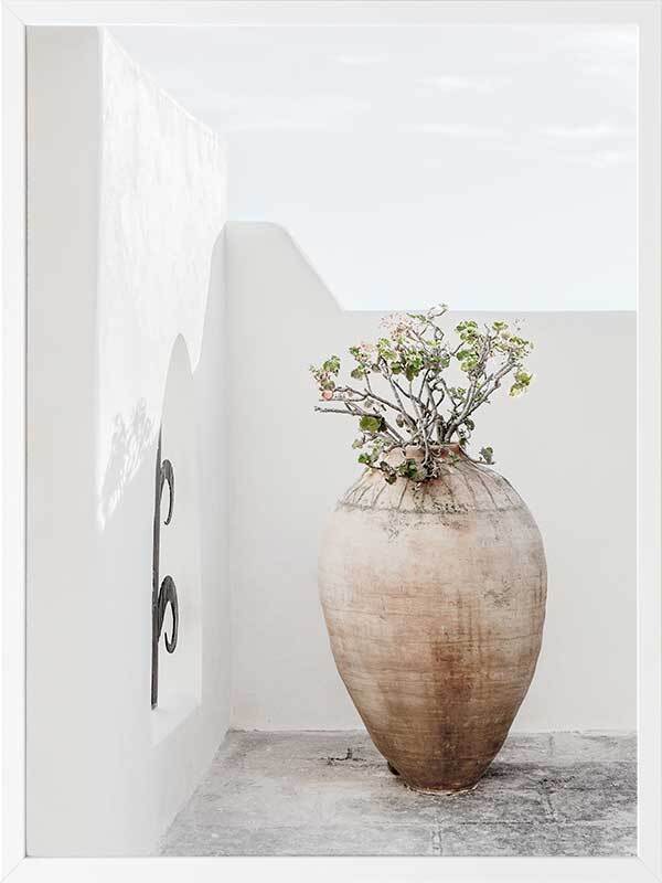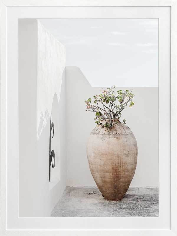 Terracotta Pot Framed Art Print - Soft and simple, this Mediterranean themed photographic artwork features a tall terracotta pot on a classic white rendered terrace.