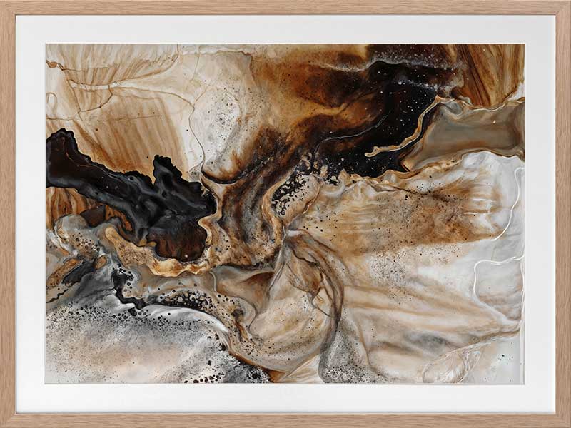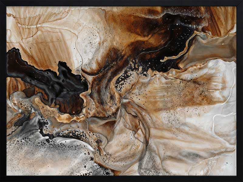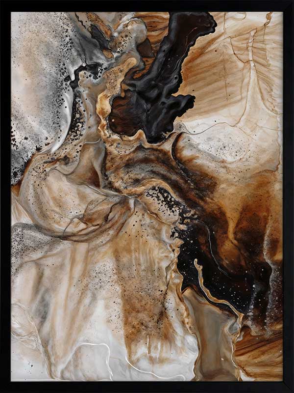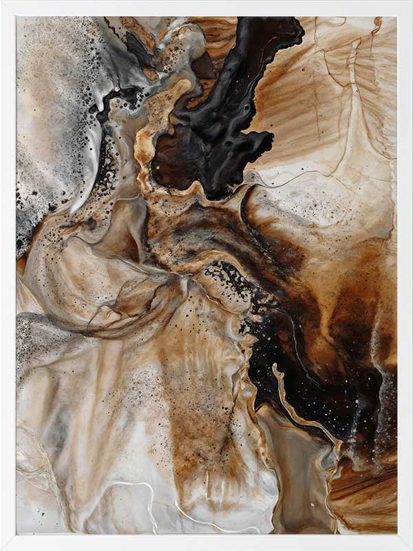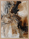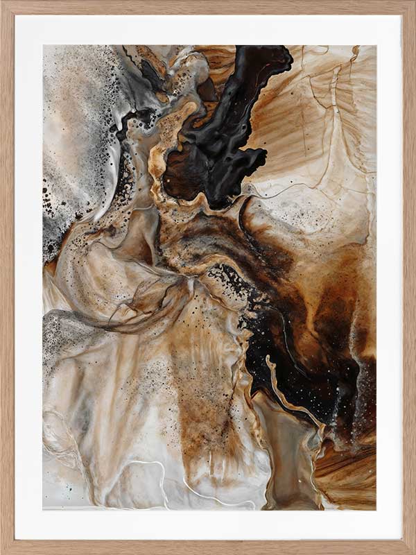 Terrain Tides II Framed Art Print - A vision of movement and calm, this abstract art print captures the ebb and flow of earthy tidal waves. Swirling with rich neutral tones of brown, beige, grey, and black, its fluid design mimics the beauty of nature from above - like an aerial glimpse of a dreamlike, earthen ocean. A striking yet serene addition to any modern interior, it brings a quiet rhythm to your space.