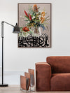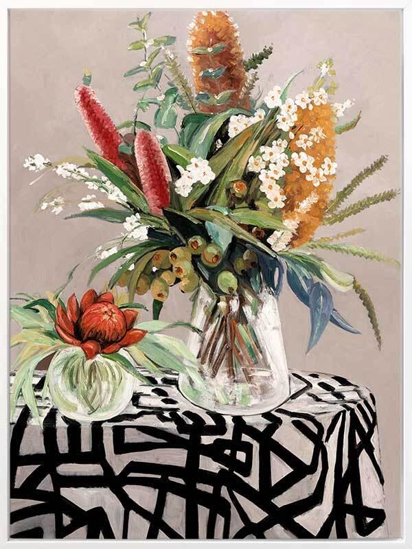 The Centrepiece Canvas Art Print - A beautifully balanced still life featuring vasefuls of brightly coloured florals on a black and white patterned table cloth with a soft fawn coloured background.