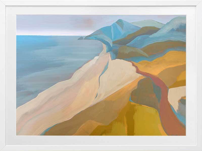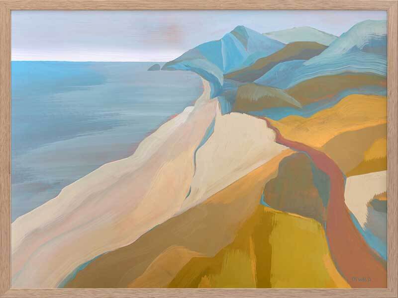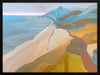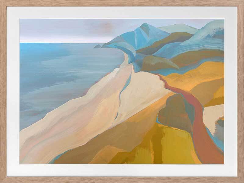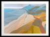 The Coastline Framed Art Print - An abstract landscape piece, this artwork uses flat colouring and intentional shapes to create a unique, dreamy view of a long coastal drive, reminding us of salty sea air whipping through our hair, and pink sunsets in the distance. Complementary colours of warm oranges and yellows against cool-toned blues bring any wall to life.