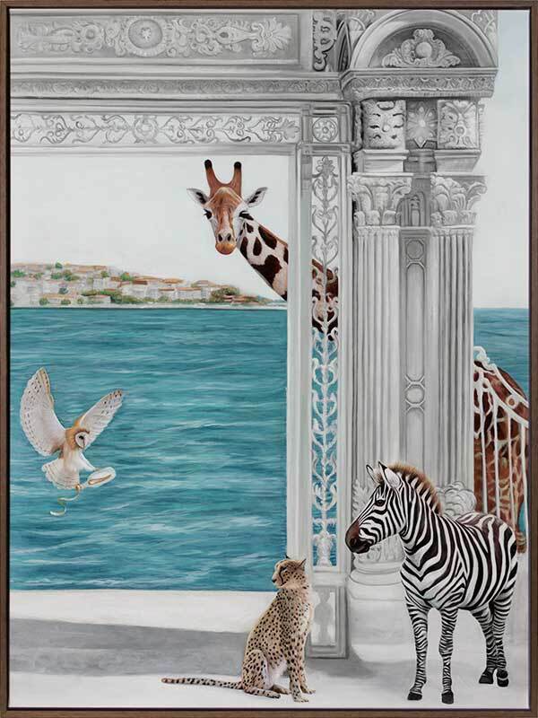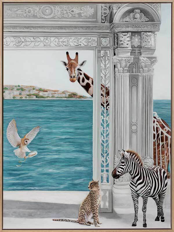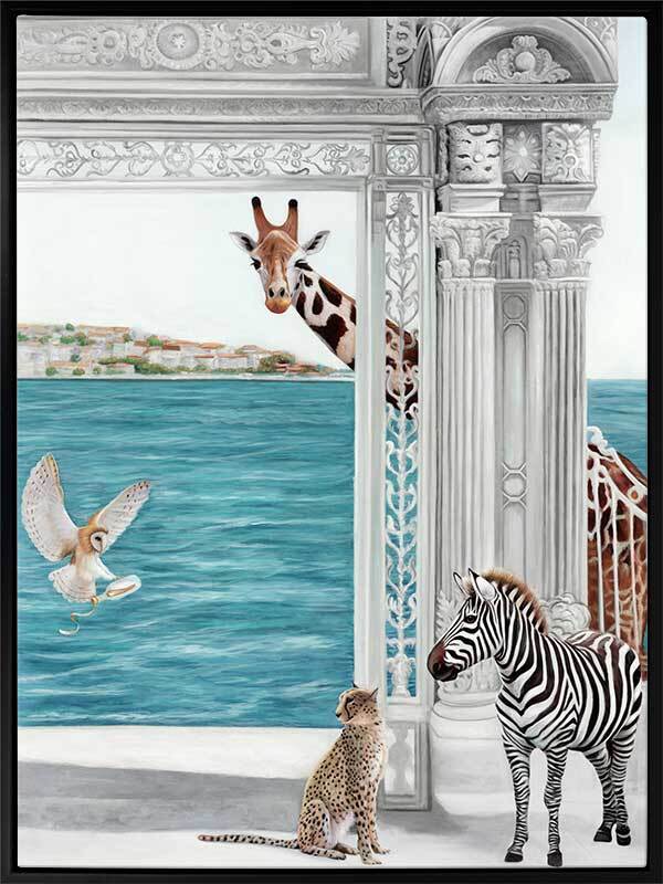 The Message Canvas Art Print: A whimsical art print that features a giraffe, a zebra, a cheetah, and an owl carrying a message in a bottle. The animals are standing by a stone archway by a bright aqua ocean. 2019 SPRING/SUMMER COLLECTION: SOLSTICE