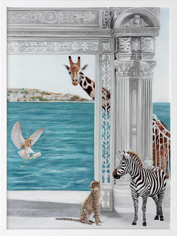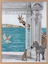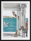 The Message Framed Print: A whimsical art print that features a giraffe, a zebra, a cheetah, and an owl carrying a message in a bottle. The animals are standing by a stone archway by a bright aqua ocean. 2019 SPRING/SUMMER COLLECTION: SOLSTICE