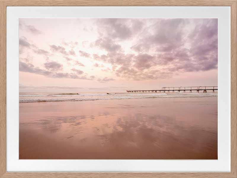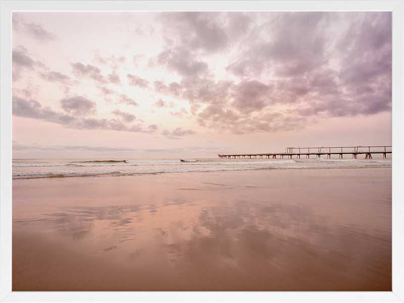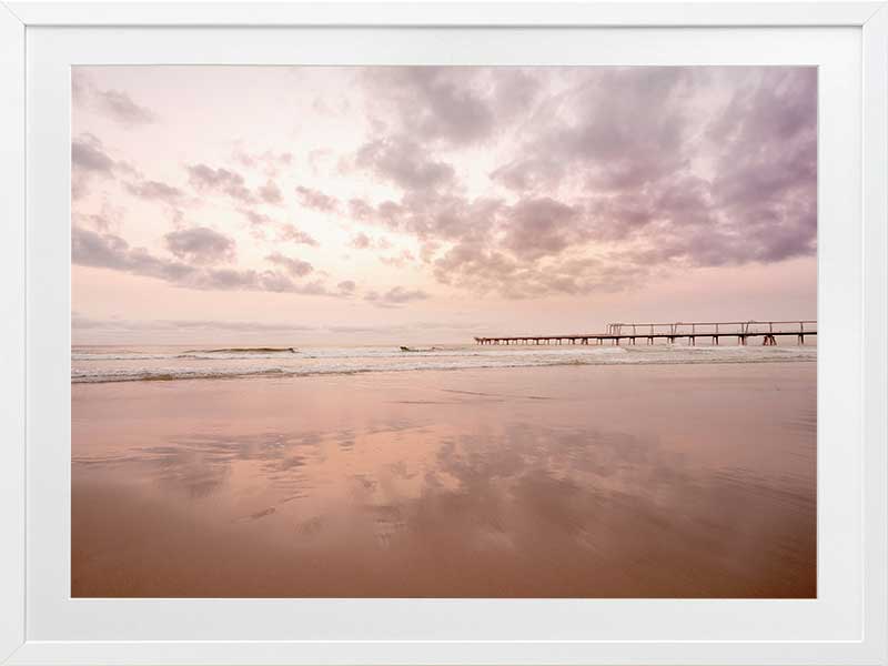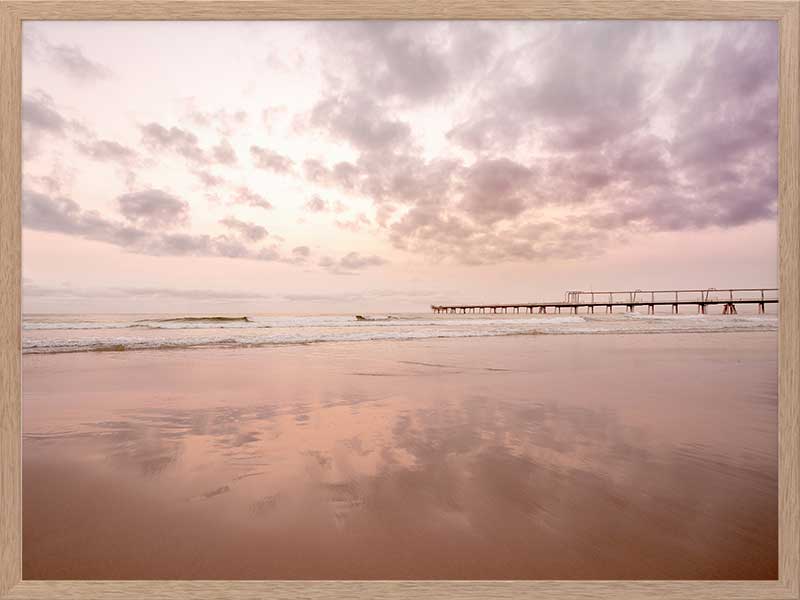 The Pier - A stunning photographic artwork featuring the peach and pink sunrise over the ocean on the Gold Coast, with the beautiful light, colours and clouds reflecting on the shore.