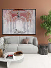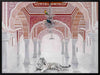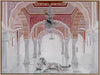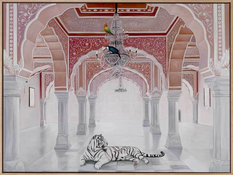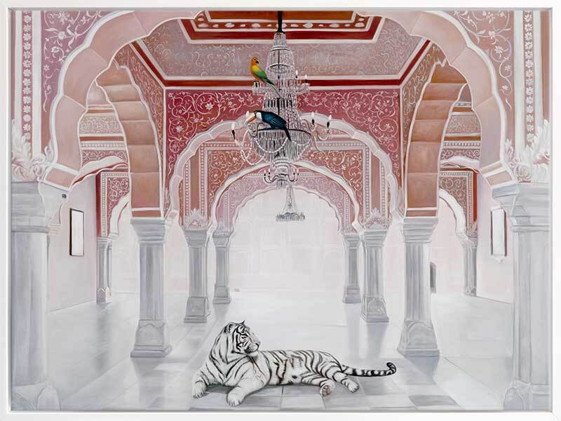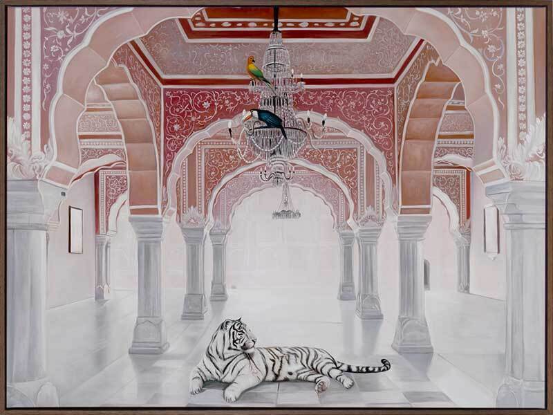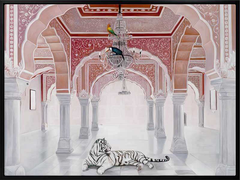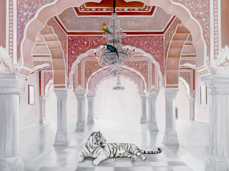 The Queen's Court Canvas Art Print: An eccentric art print that features a white tiger, a toucan and a parrot inside a grand palace in Jaipur filled with intricate decor and extravagant chandeliers. This is a print of an original hand painted oil painting with small detailed brush strokes on canvas. 2020 AUTUMN/WINTER COLLECTION: REVERIE